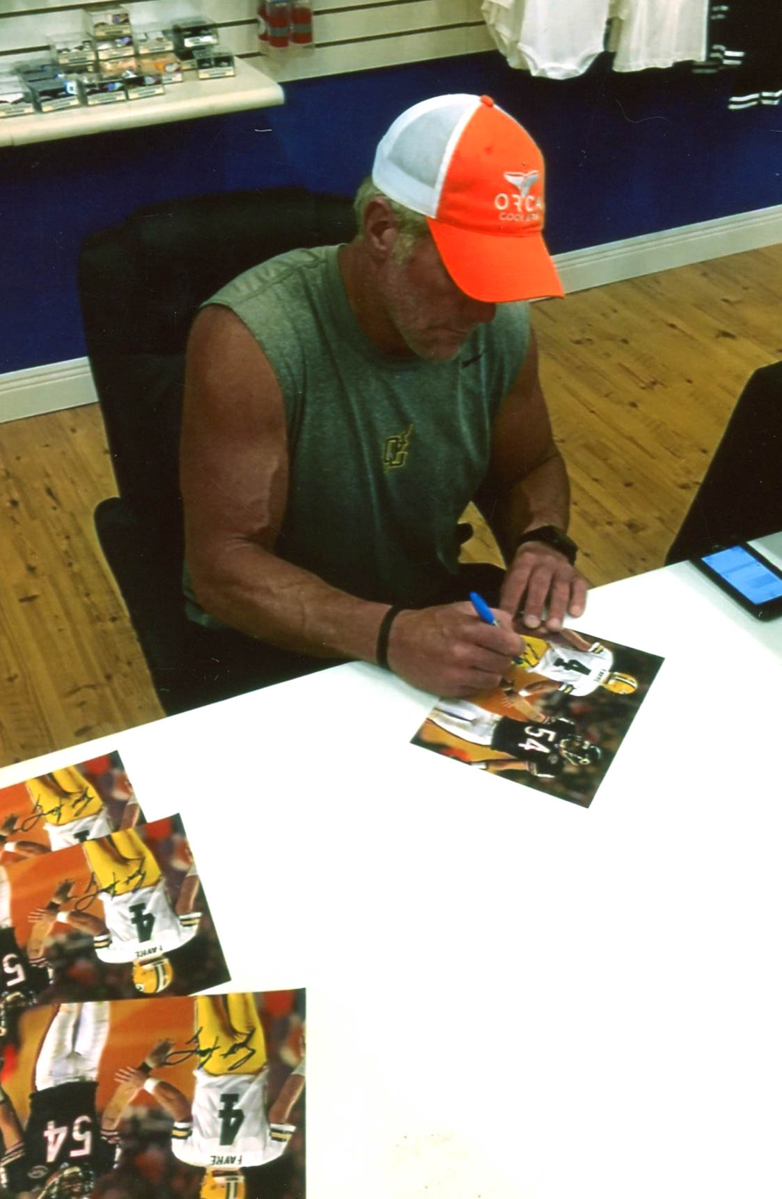 Photo measures 8" x 10" in size and has been hand signed by Brett Favre (Green Bay Packers, HOF).