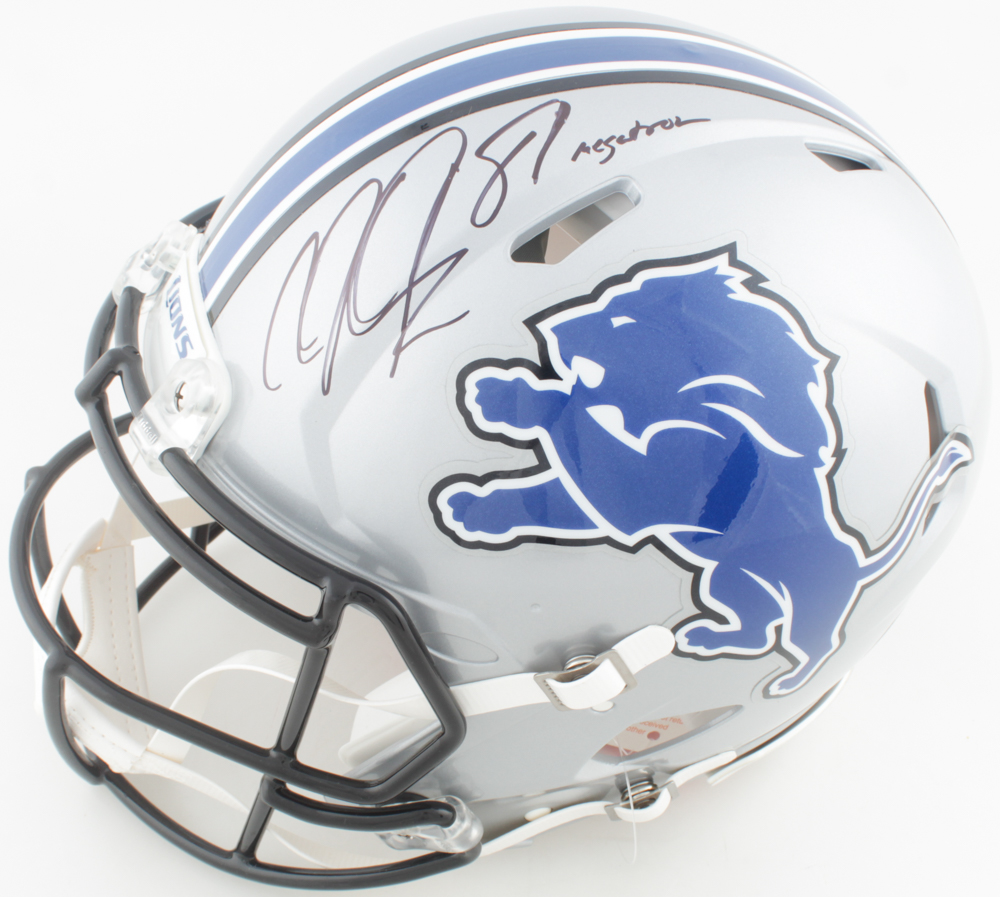 Riddell Detroit Lions full-size authentic on-field speed helmet. Hand-signed by Calvin Johnson.