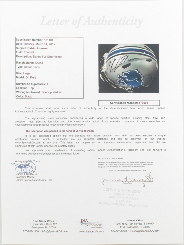 Calvin Johnson Signed Lions Full-Size Authentic On-Field Speed Helmet (JSA LOA)