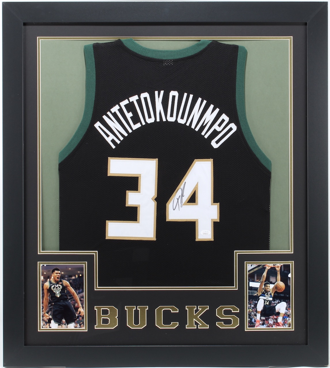 Custom frame measures approximately 31" x 35" in size and features a jersey which has been hand-signed by Giannis Antetokounmpo.