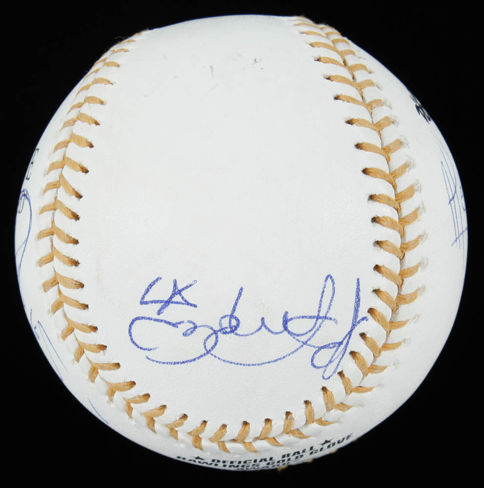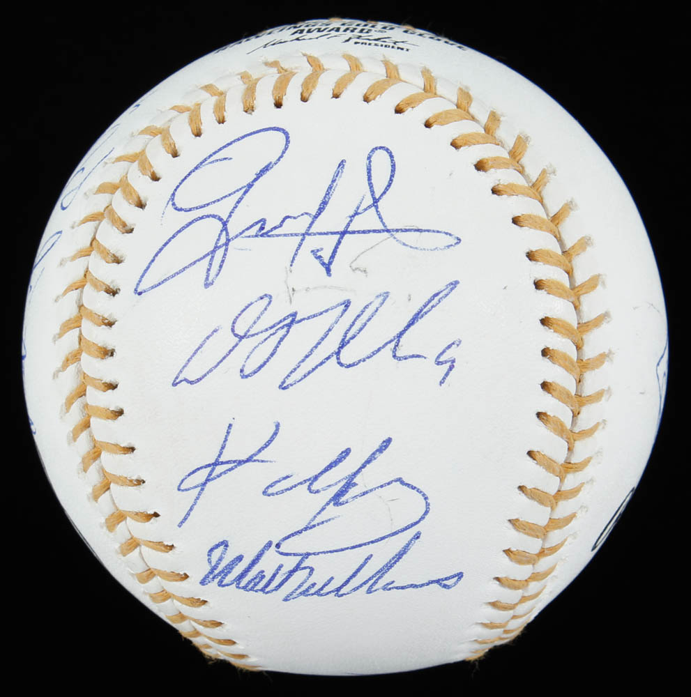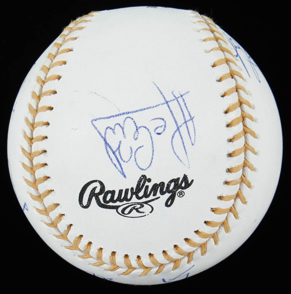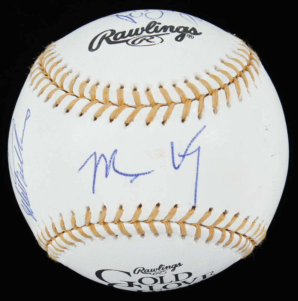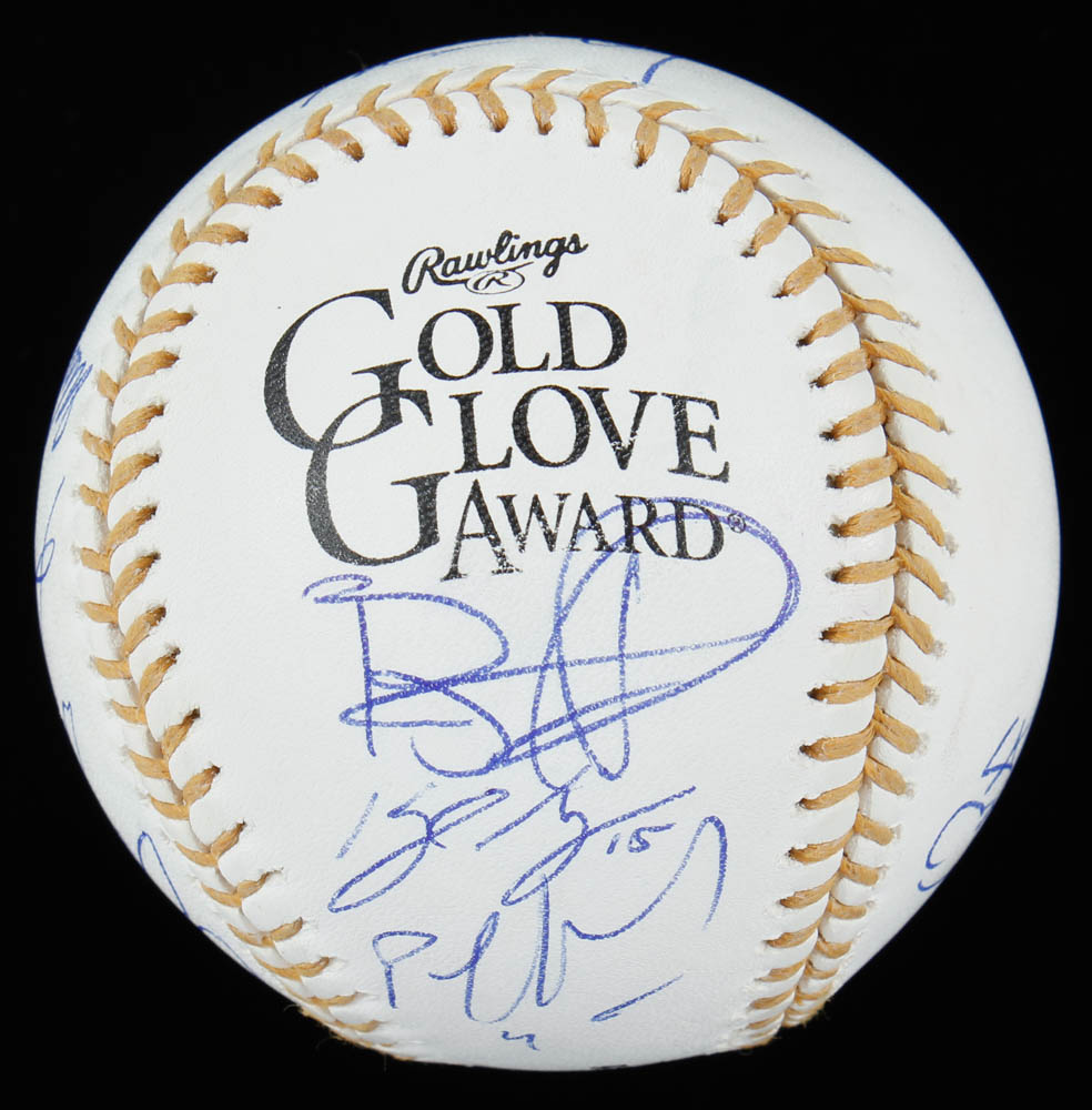 Rawlings Official Gold Glove Award Baseball. Hand-signed by Paul Goldschmidt (St. Louis Cardinals), Brandon Phillips (Cincinnati Reds), Kyle Seager (Seattle Mariners), Bengie Molina (Los Angeles Angels of Anaheim), and DJ LeMahieu (Colorado Rockies), Matt Kemp (Los Angeles Dodgers), Alcides Escobar (Kansas City Royals), Kevin Youkilis (Boston Red Sox), Geraldo Parra (Washington Nationals) and Matt Williams (Arizona Diamondbacks).
