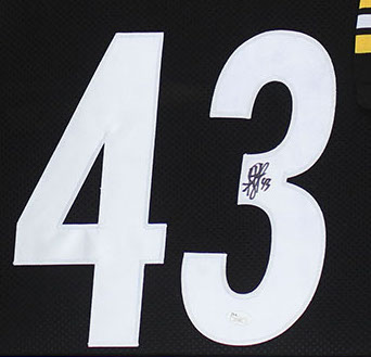 A beautifully framed autographed Troy Polamalu Steelers Jersey. The autograph was certified by JSA and includes a sticker on the Jersey and a matching certificate attached to the back of the frame.