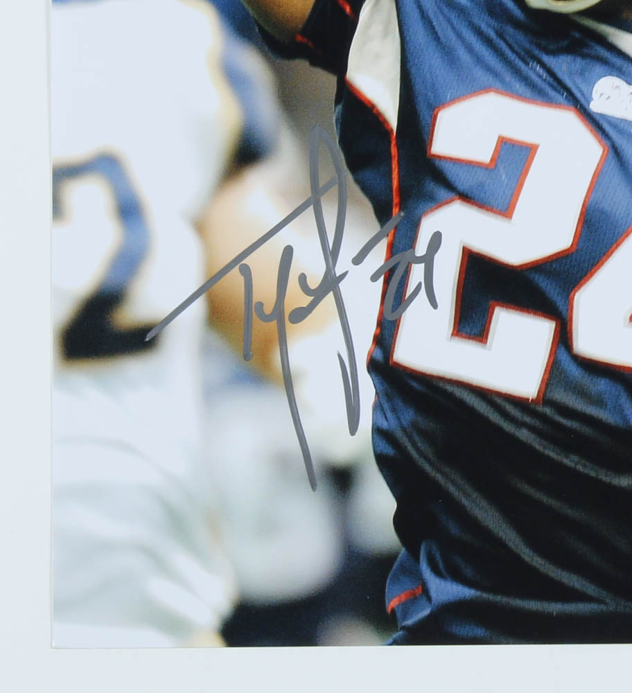 Photo measures 11" x 14" in size and has been hand-signed by Ty Law. (New England Patriots, HOF).