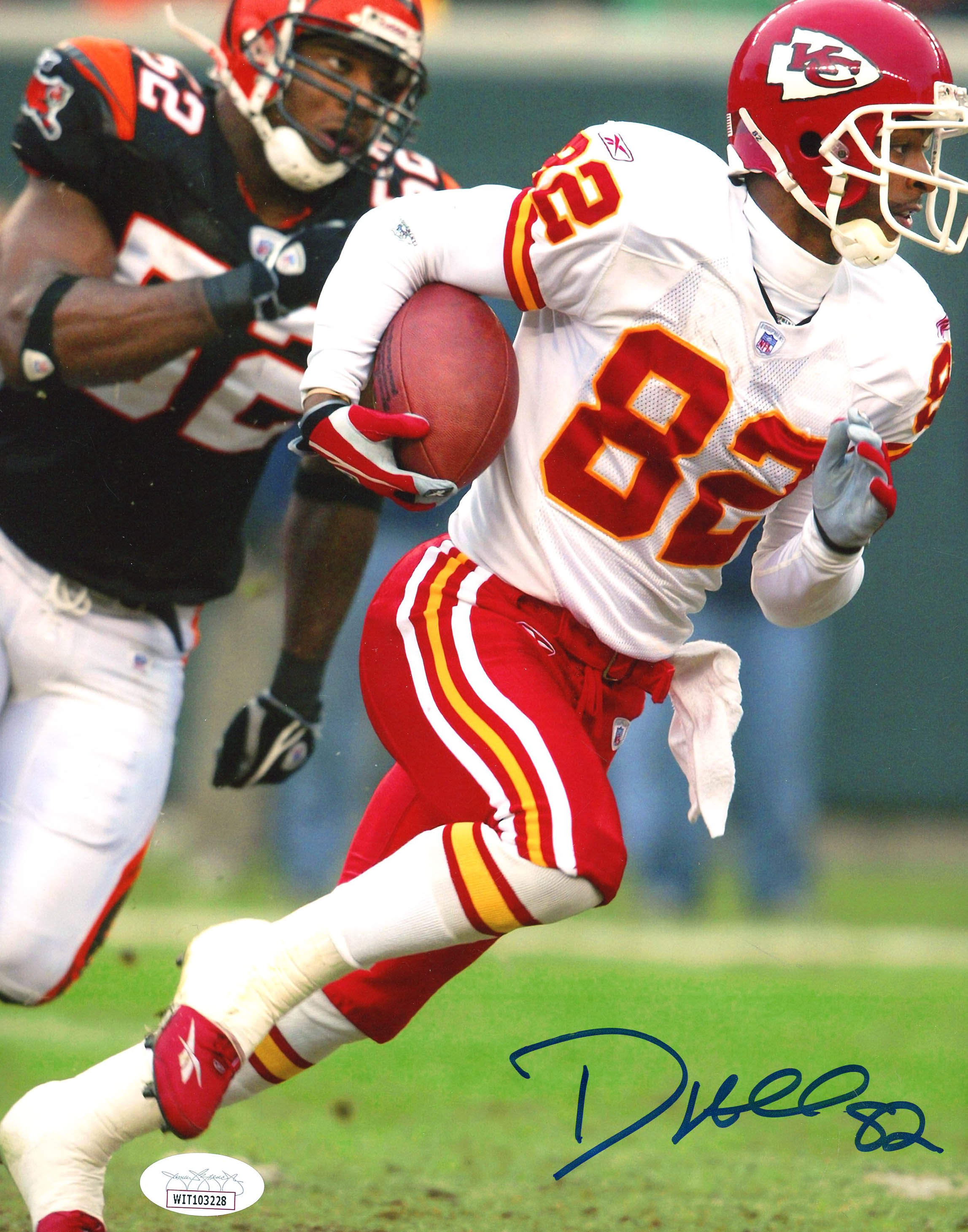 Photo measures 8" x 10" in size and has been hand-signed by Dante Hall (Kansas City Chiefs).