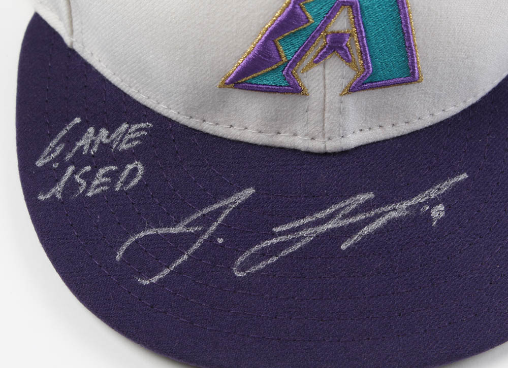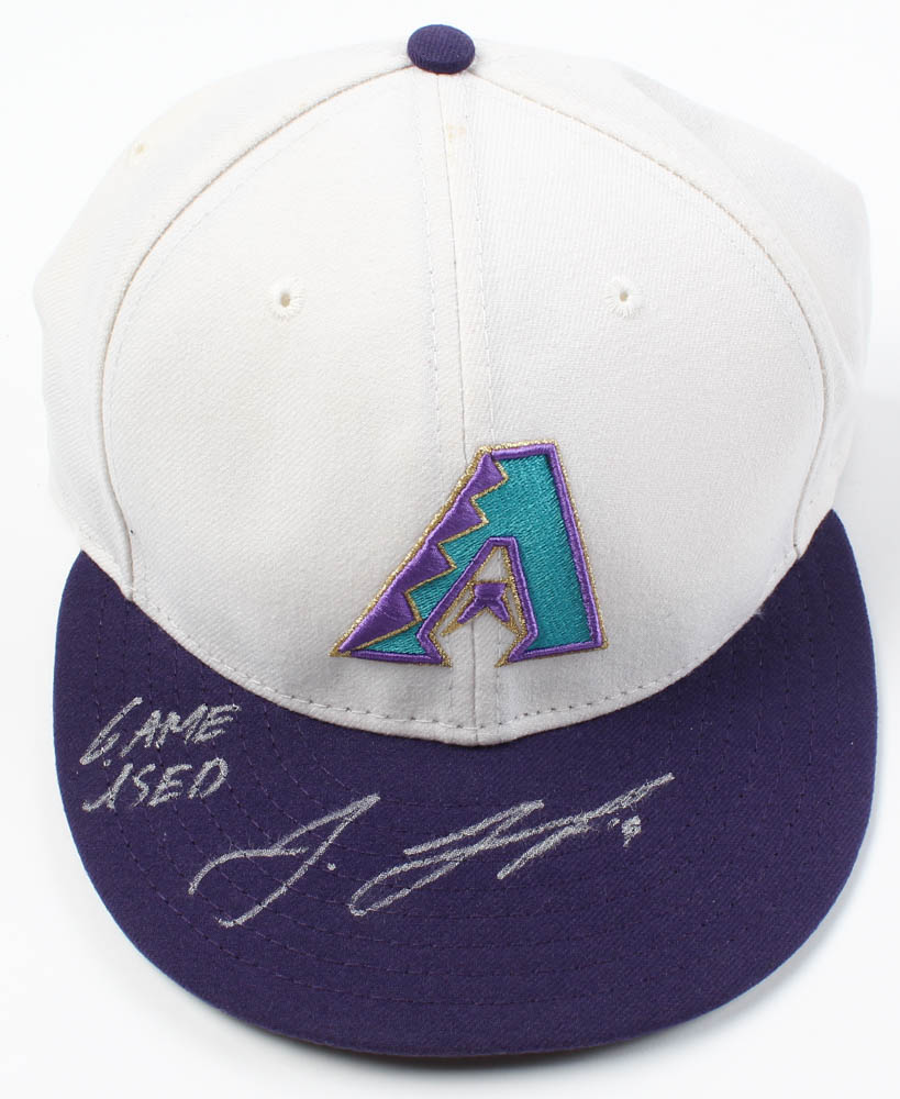 Game-used MLB Arizona Diamondbacks baseball cap. Hand-signed and inscribed by Jake Lamb. Please see images for details regarding the condition of the hat.