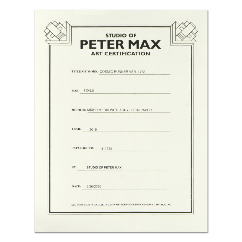 "Cosmic Runner" is a one-of-a-kind acrylic mixed media on paper, hand signed by Peter Max. Includes Certificate of Authenticity from Peter Max Studios. This piece comes custom framed. Measures approx. 21" x 23.5" (with frame), 8.5" x 11" (image).