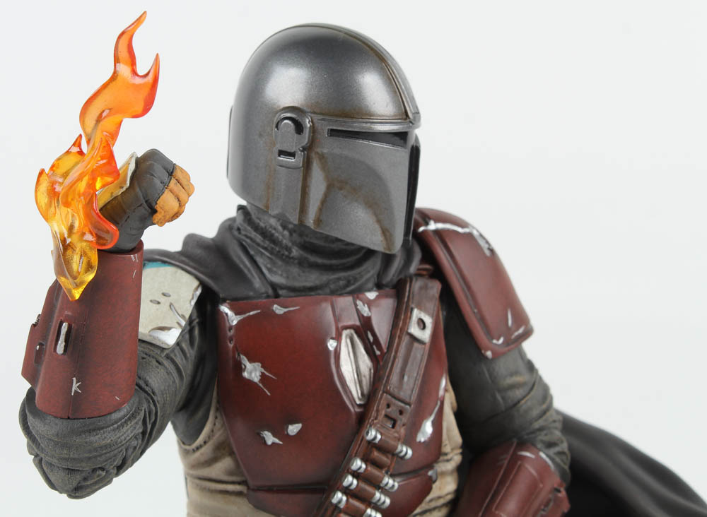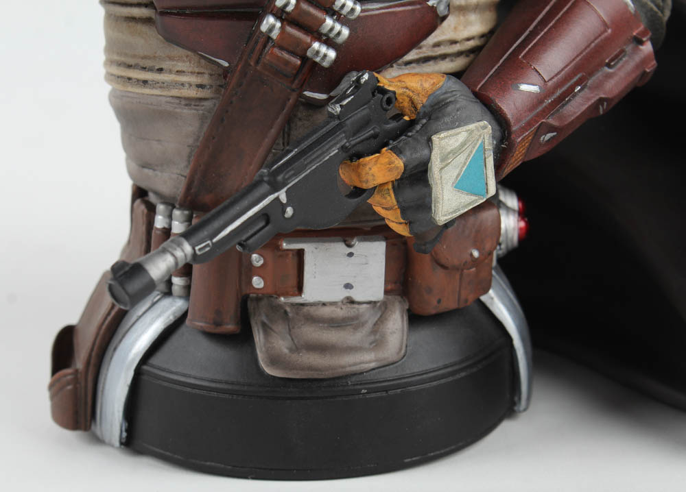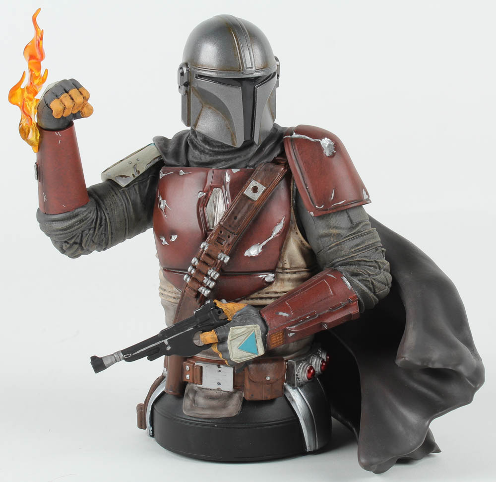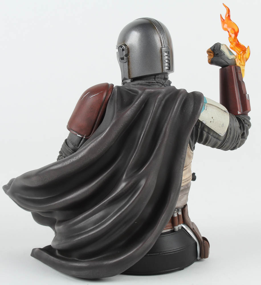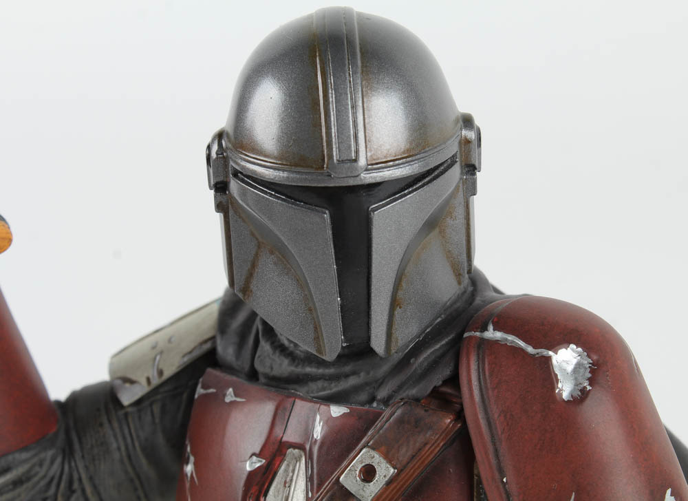 Measuring approximately 6-inches tall, this 1:6 scale resin bust of the Mandalorian features detailed sculpting and paint applications. Comes with a certificate of authenticity in a full-color box. Designed and sculpted by Gentle Giant Studios.