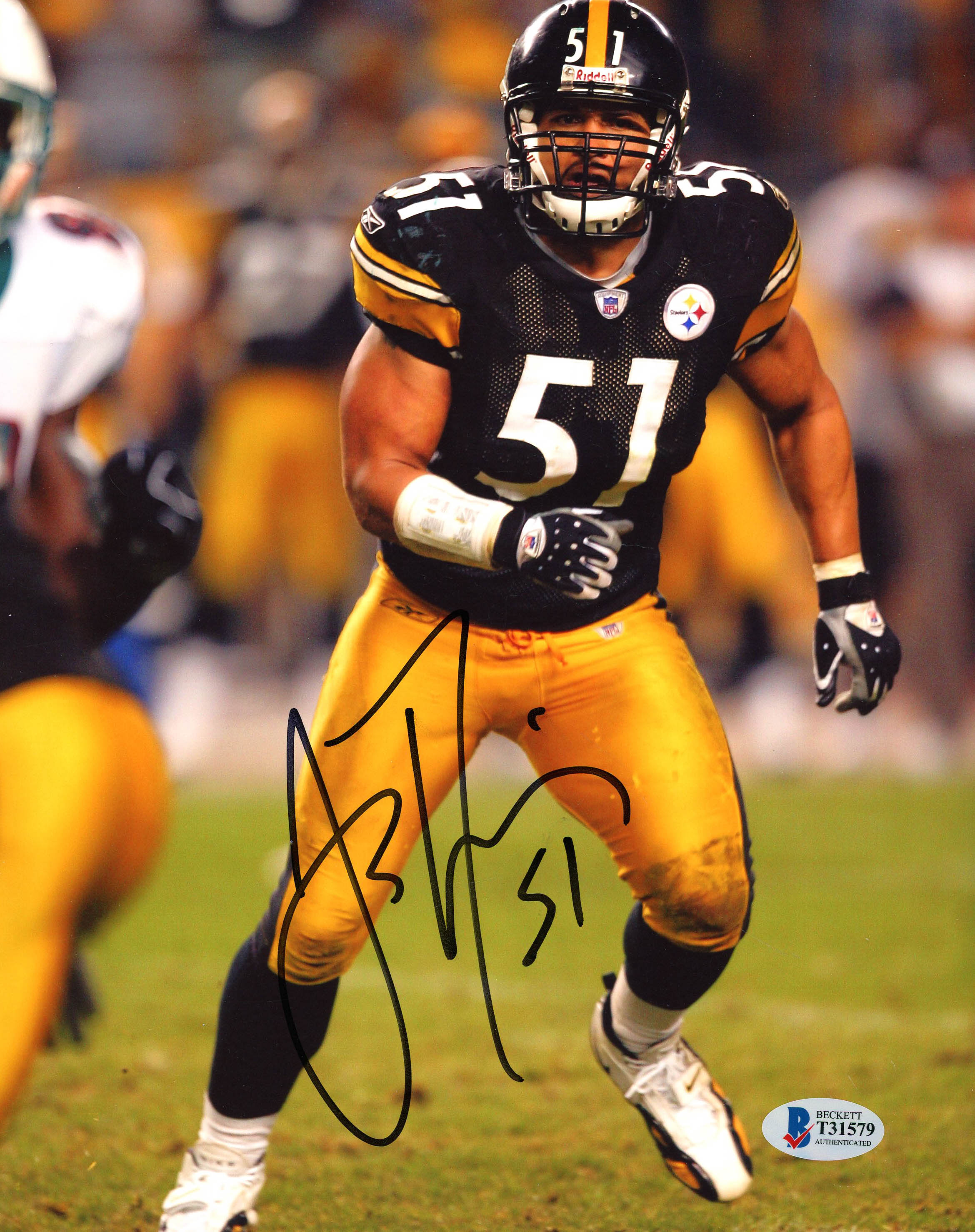 Photo measures 8" x 10" in size and has been hand-signed by James Farrior (Pittsburgh Steelers).