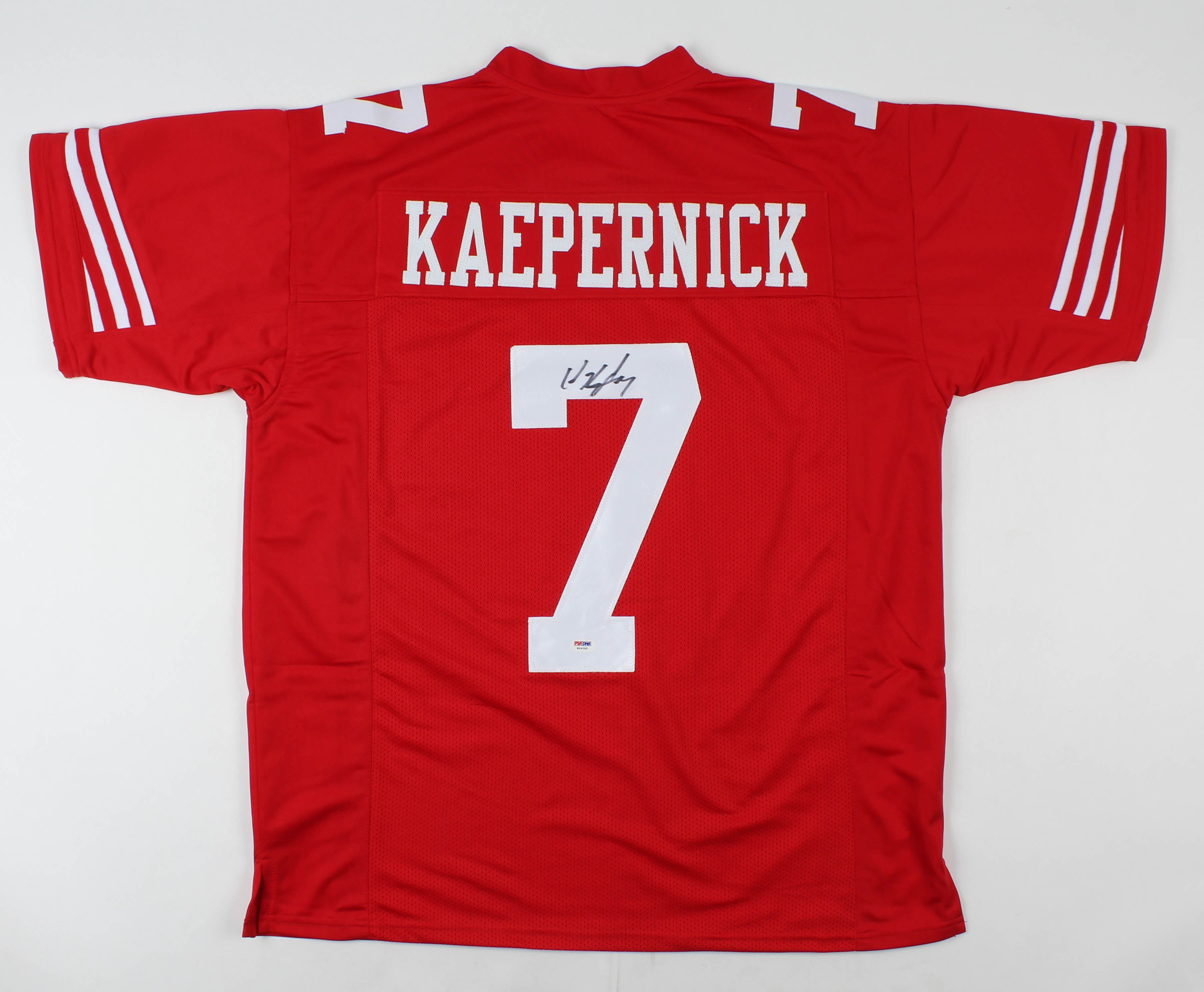 Custom on-field style jersey. Everything sewn on, size XL. Hand-signed by Colin Kaepernick.