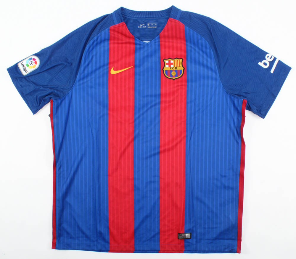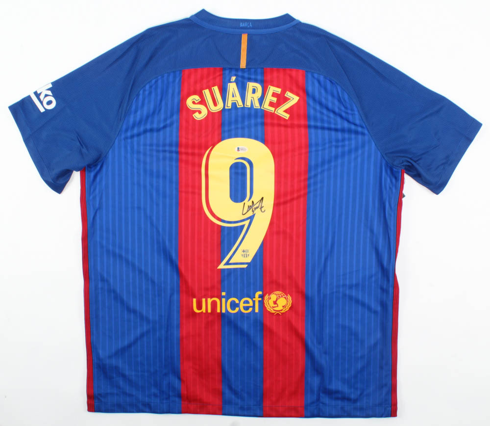 Nike on-field style jersey. Everything printed on, size XL. Hand-signed by Luis Suarez.