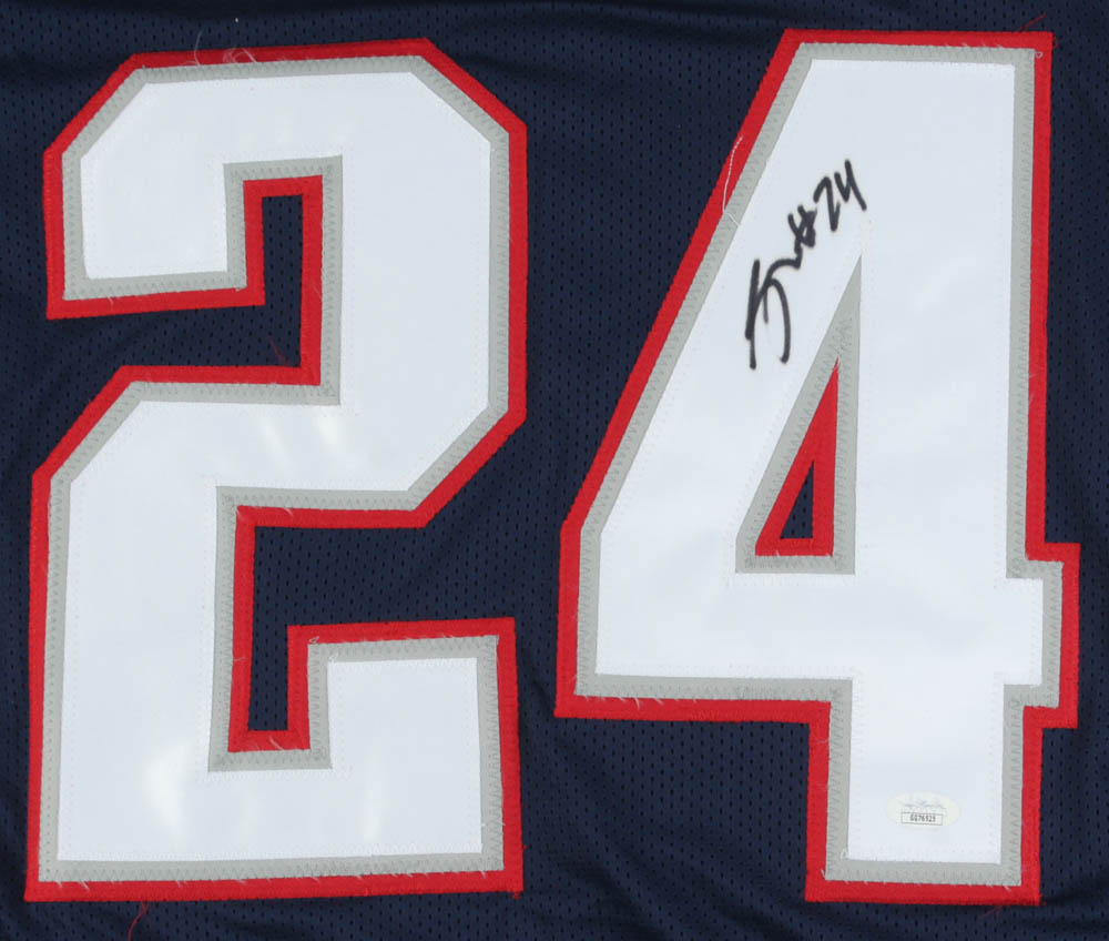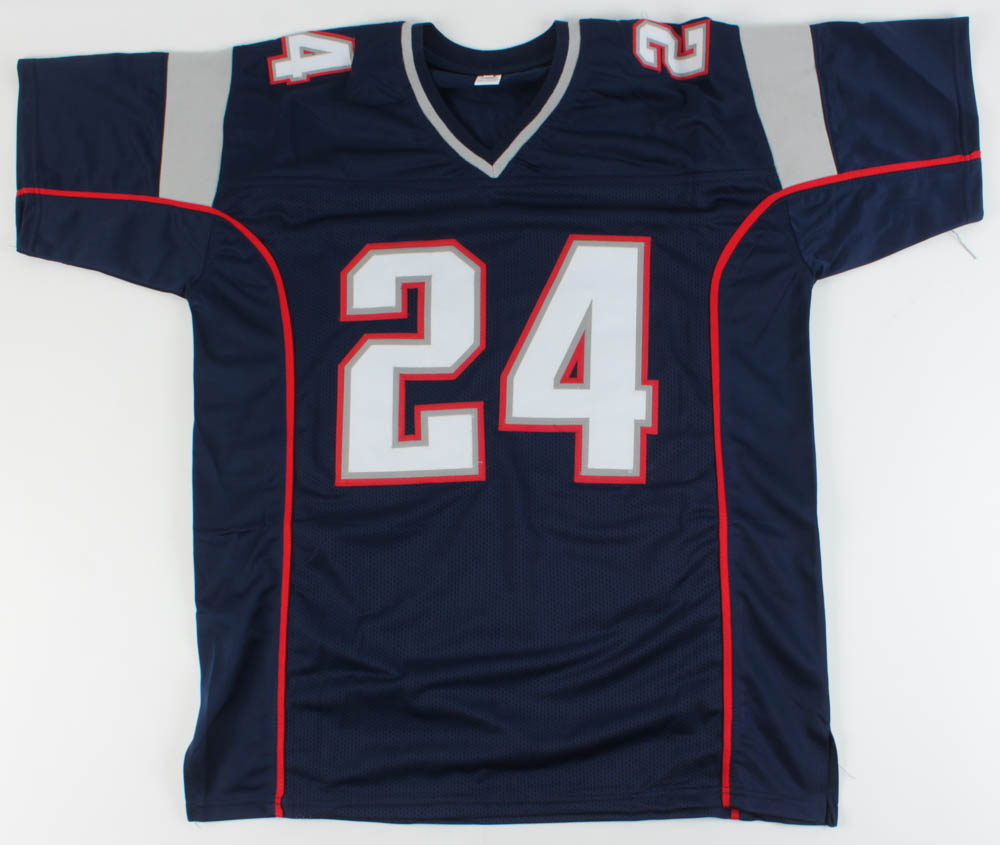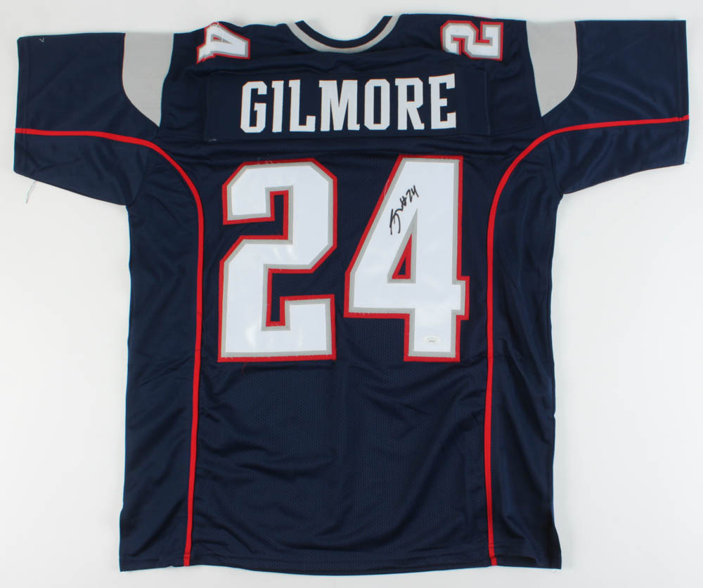 Custom on-field style jersey. Everything is sewn on, size XL. Has been hand-signed by Stephon Gilmore.