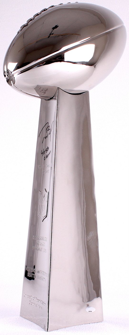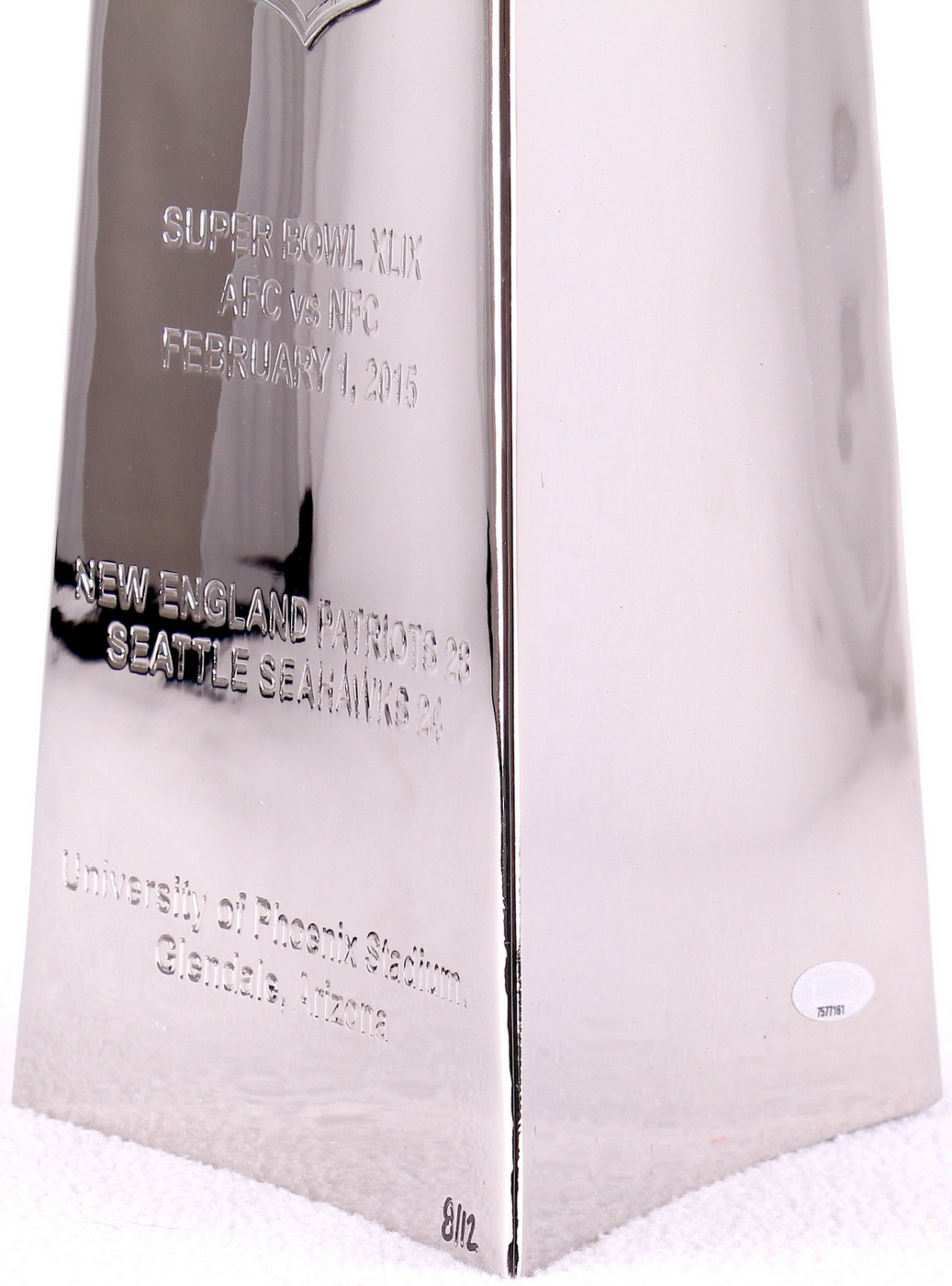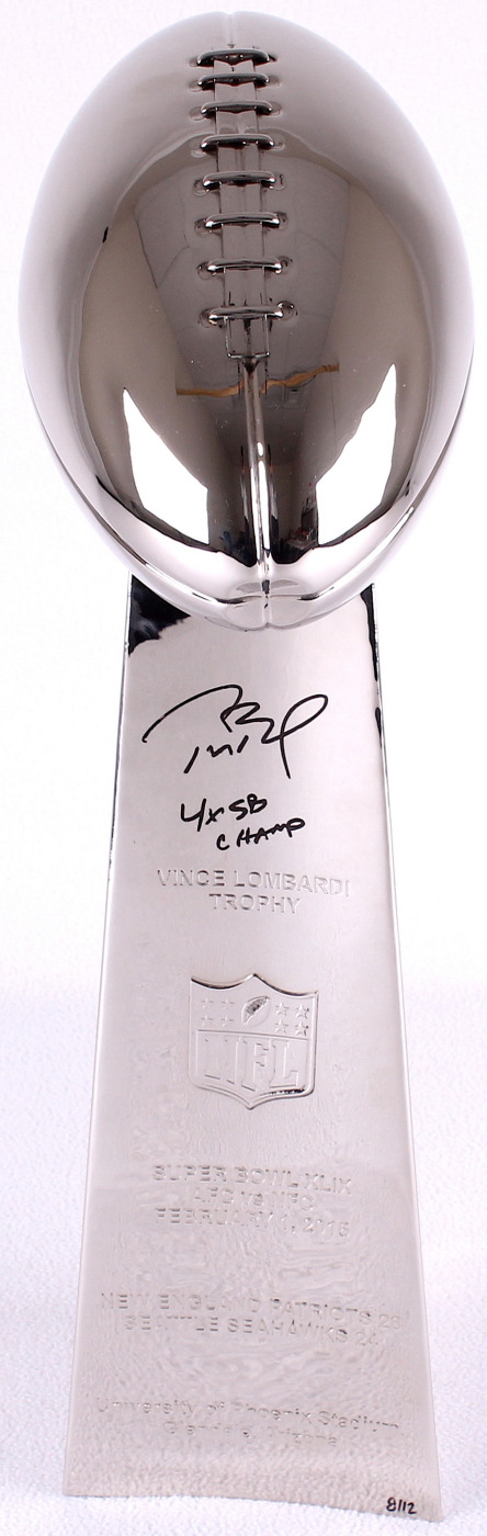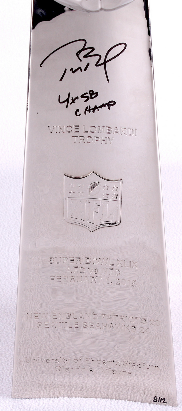 Full size replica Super Bowl XLIX Lombardi trophy measures 22" in height and is hand-signed and inscribed in black felt-tip pen by Tom Brady (Patriots). Limited edition hand-numbered 8/12.