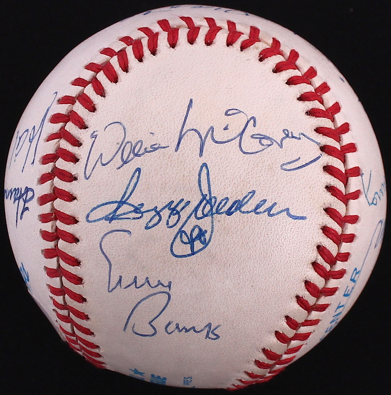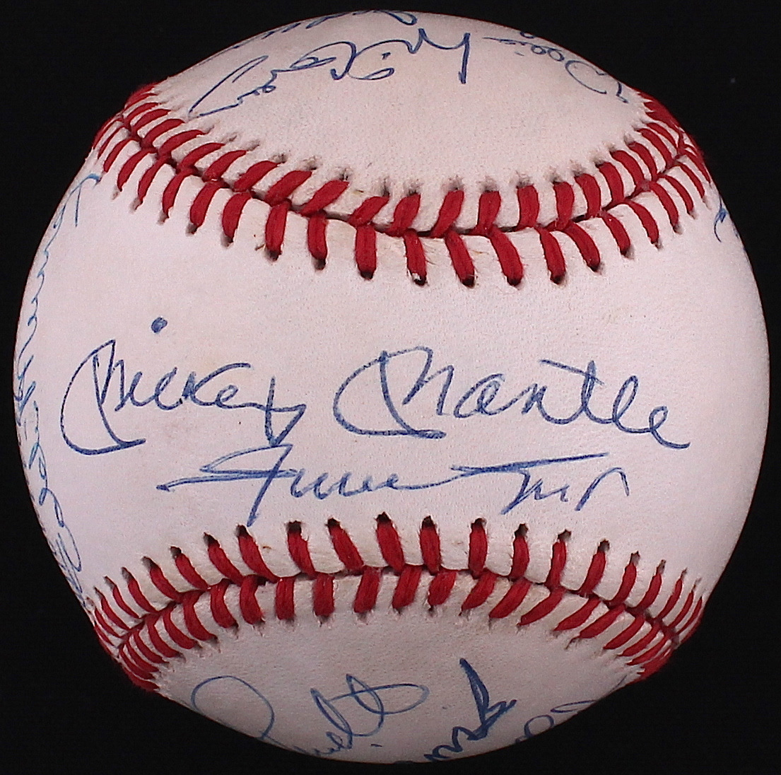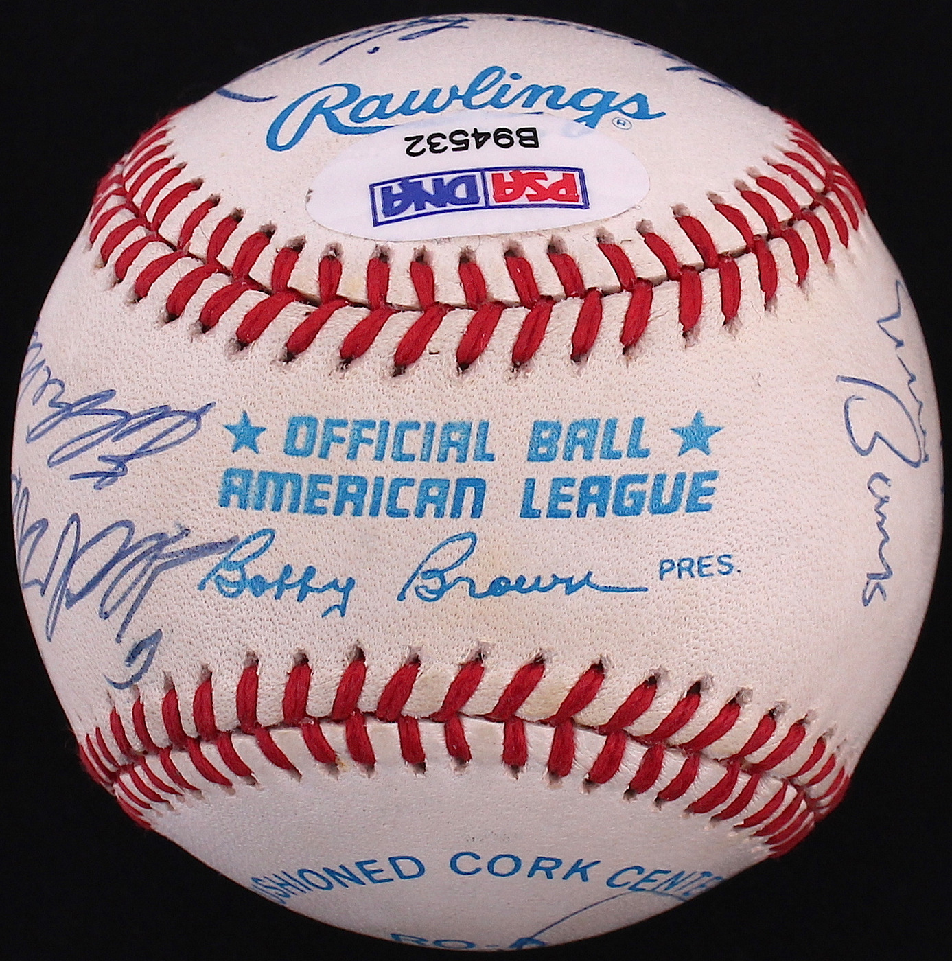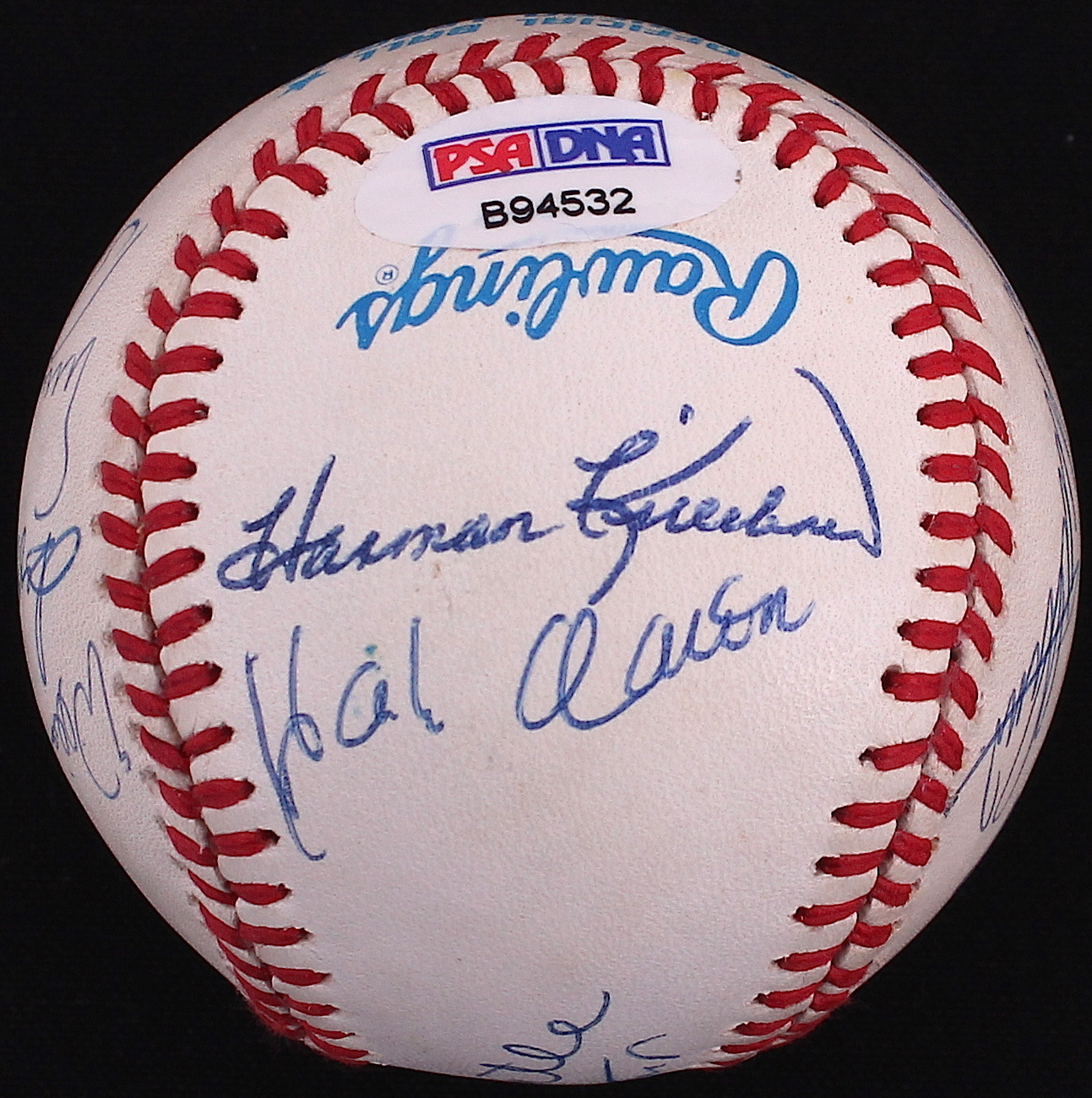 Official American League Baseball. Hand-signed in blue ink pen by (12) members of the 500 Home Run Club. The autographs include Mickey Mantle, Ted Williams, Willie Mays, Hank Aaron, Ernie Banks, Eddie Murray, Frank Robinson, Harmon Killebrew, Reggie Jackson, Mike Schmidt, Eddie Mathews and Willie McCovey. The autographs include an official PSA/DNA hologram and matching LOA for authenticity purposes.