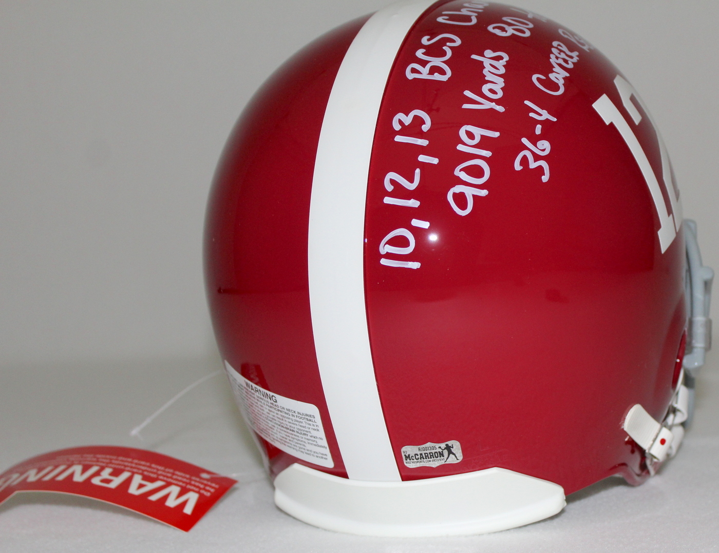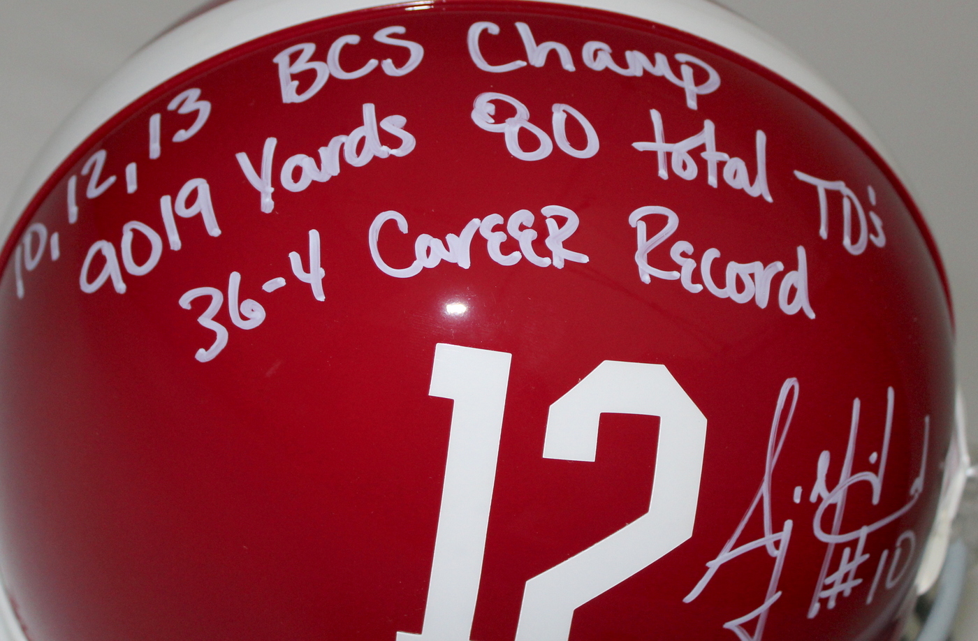 AJ McCarron Signed Alabama Full-Size Authentic Pro-Line Helmet with (4) Career Stats Inscriptions (Radtke COA)