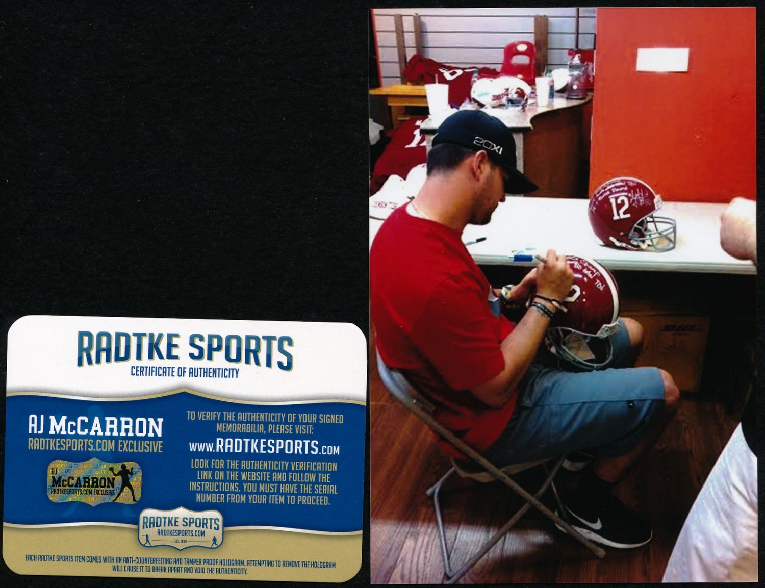 Full-size authentic pro-line helmet. Hand-signed and inscribed in white paint pen by AJ McCarron (Bengals). The autograph includes an official Radtke Sports hologram and matching COA for authenticity purposes. AJ McCarron is a Radtke Sports exclusive athlete. Also includes a proof picture from the signing.