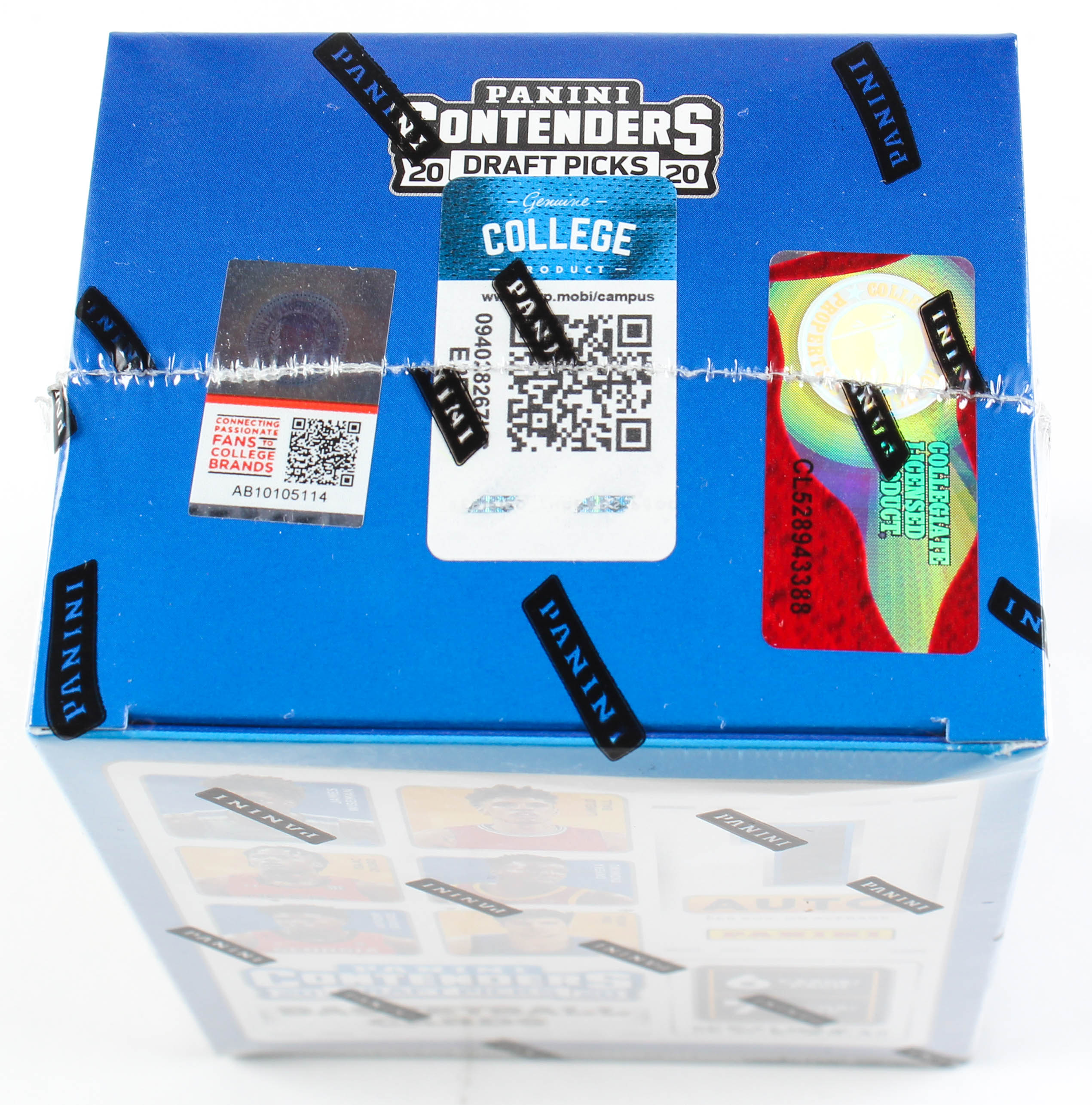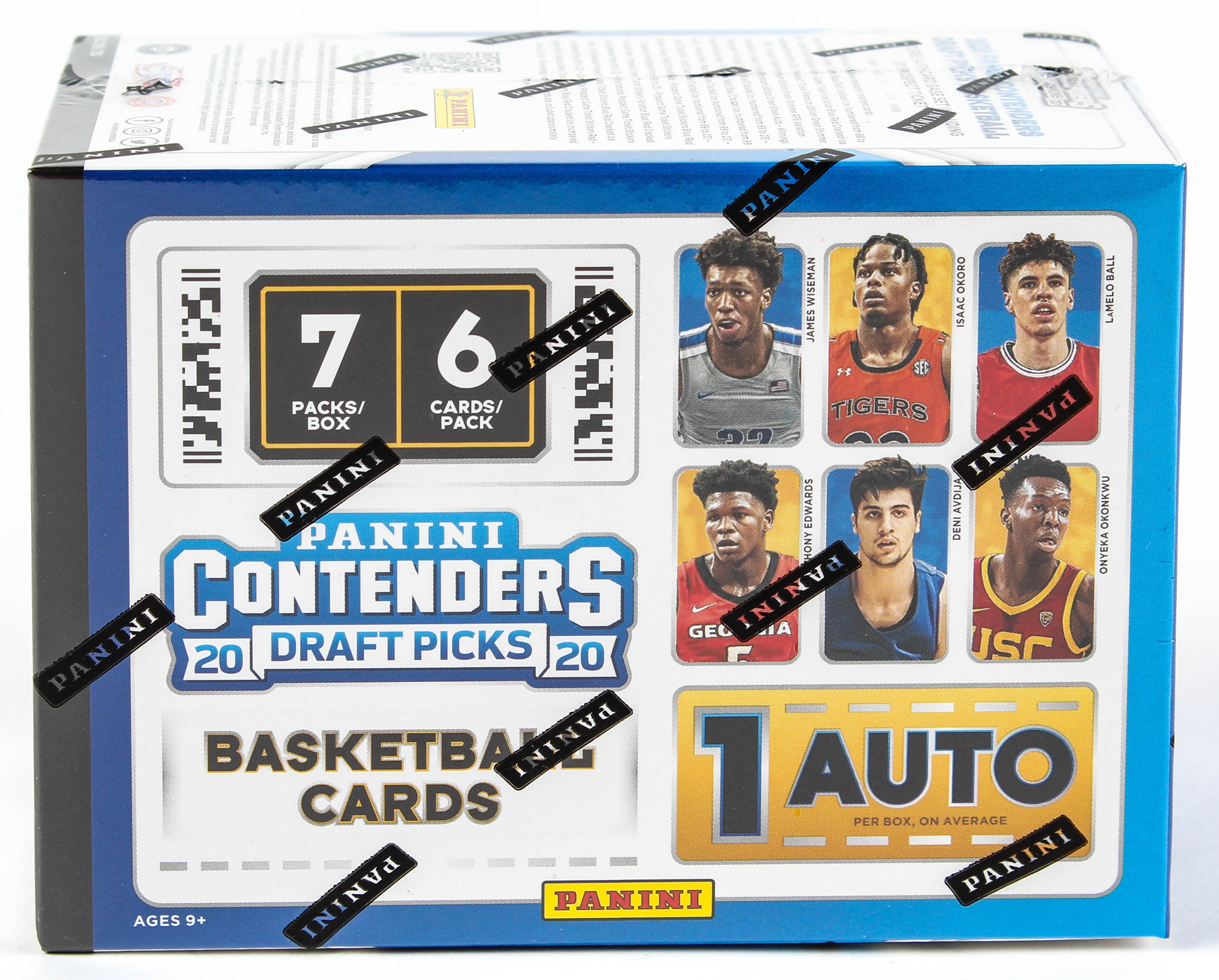 Panini presents the NBA 2020 Contenders Draft Pick trading card full box. Each box contains 7 packs per box, and 6 cards per pack. On average, there is 1 Autographed card per box. Be on the lookout for retail-exclusive premium edition Green Shimmer Autographs, and for the Cracked Ice Parallels numbered to 23.