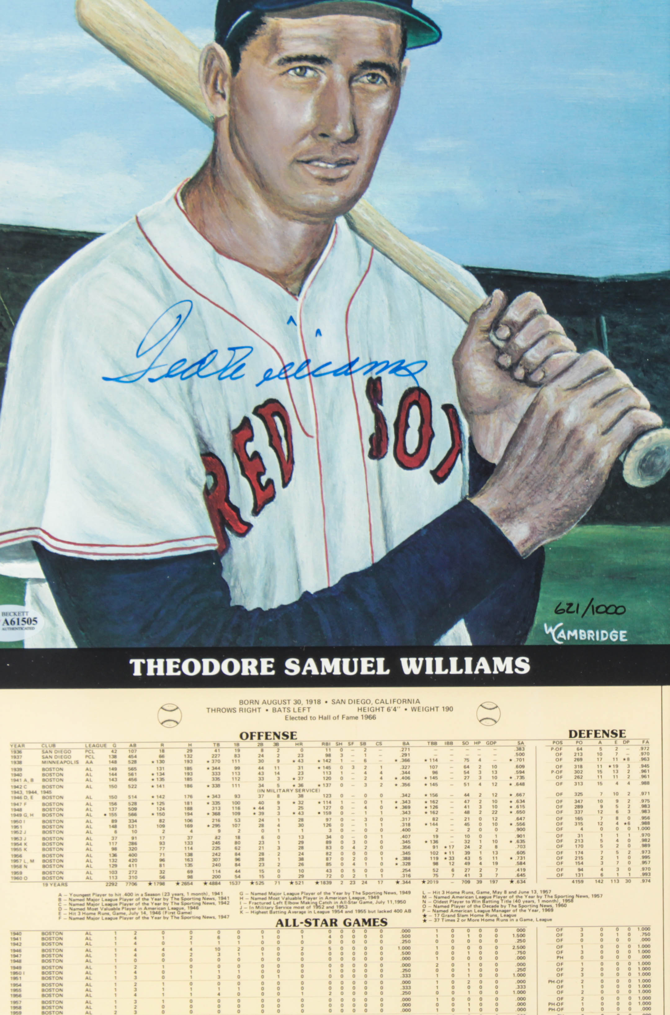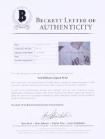 Custom matted display measures approximately 14" x 22" in size and features a career stat print which has been hand-signed by Ted Williams (D. 2002, Boston Red Sox, HOF). The print is limited edition out of #/1000. Please note, you will be receiving a random limited edition number from the same edition run.