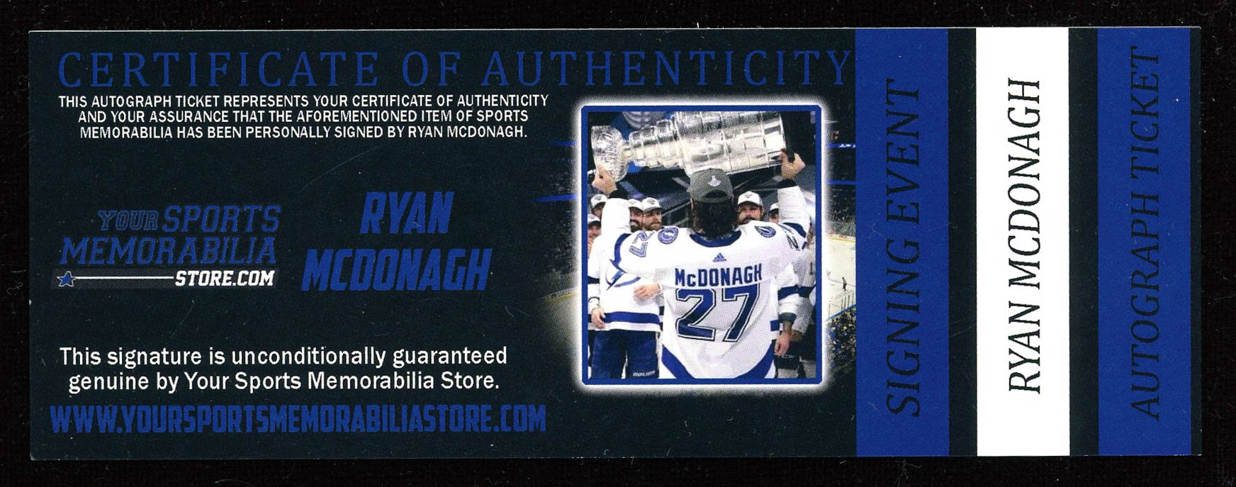 The lot / autograph(s) includes an official Your Sports Memorabilia Store Ryan McDonagh hologram and COA for authenticity purposes.