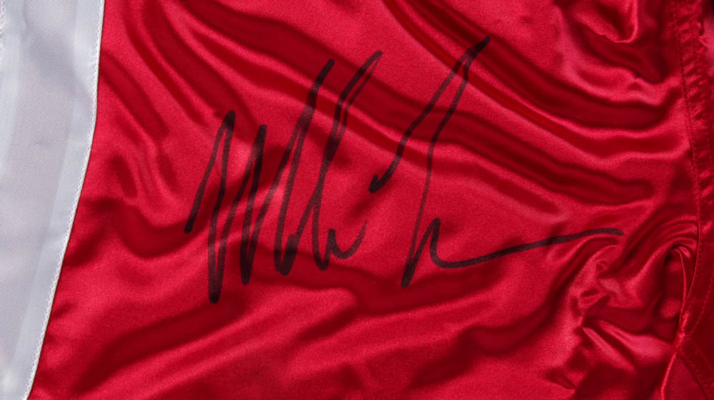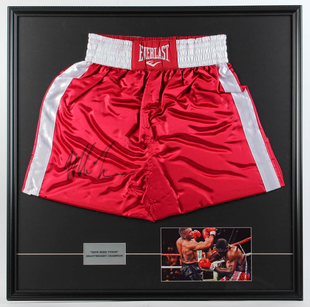 Custom frame measures 32" x 32" in size and features a pair of Everlast boxing trunks that have been hand-signed by Mike Tyson (HOF).