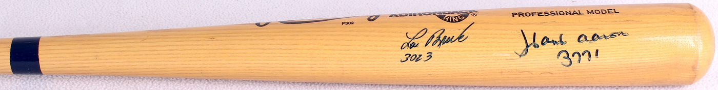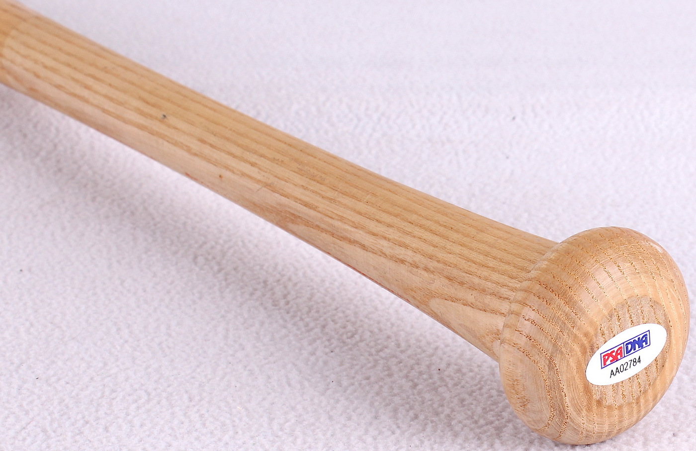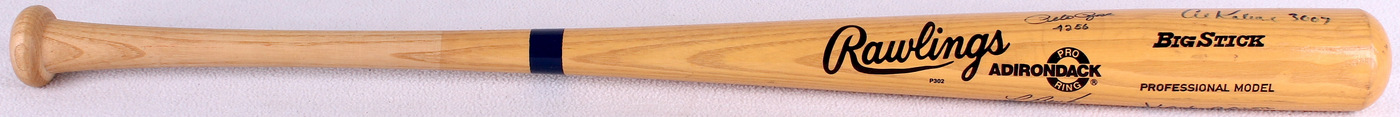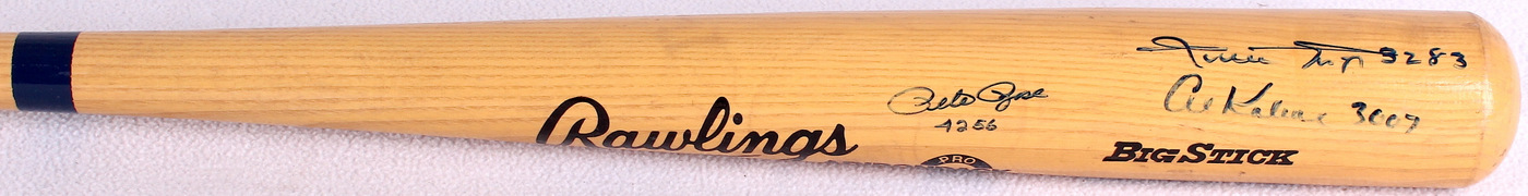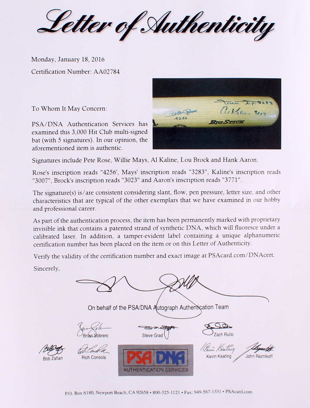 Rawlings Pro Model Big Stick Baseball Bat. Hand-signed and inscribed in blue felt-tip pen by (5) members of the 3,000 hit club. The autographs include Willie Mays (Giants HOF), Hank Aaron (Braves HOF), Lou Brock (Cardinals HOF), Pete Rose (Reds) and Al Kaline (Tigers HOF). The autograph includes an official PSA/DNA hologram and matching LOA for authenticity purposes.