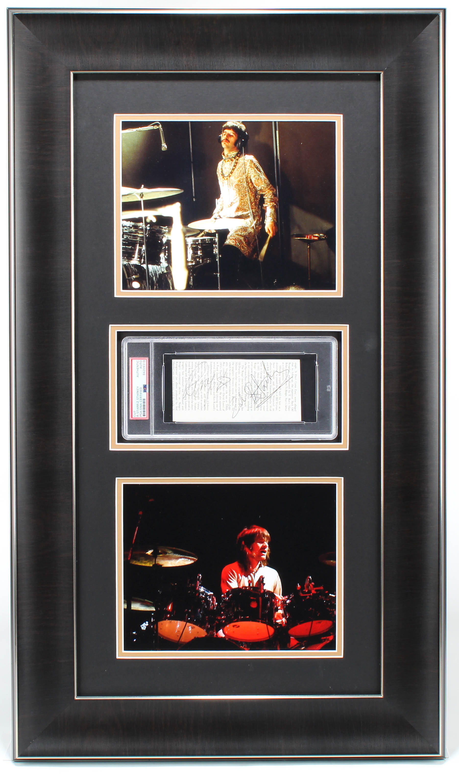 Custom frame measures 19" x 33" in size and features a cut that has been hand-signed by Ringo Starr and Zak Starkey.
