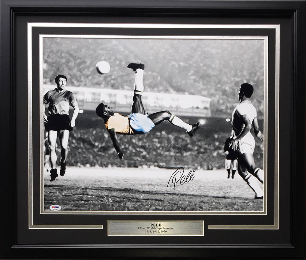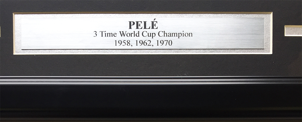 Custom framed photo display measures 22" x 27" in size and has been hand signed by Pele (HOF)