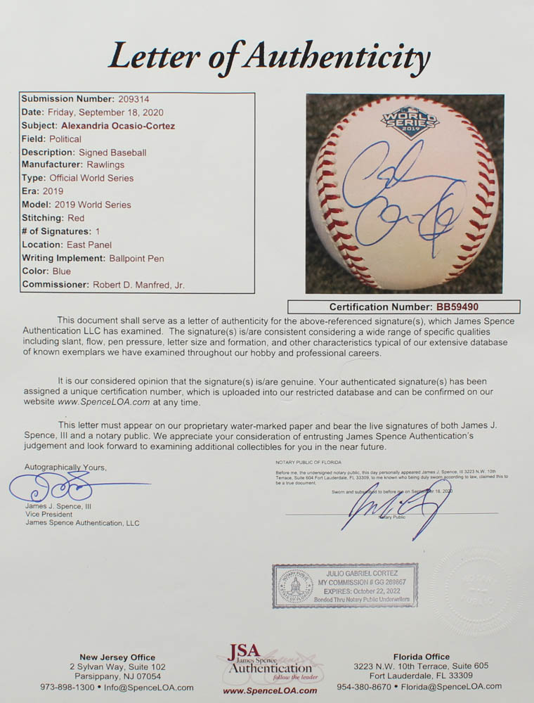 Alexandria Ocasio-Cortez Signed 2019 World Series Baseball (JSA LOA)