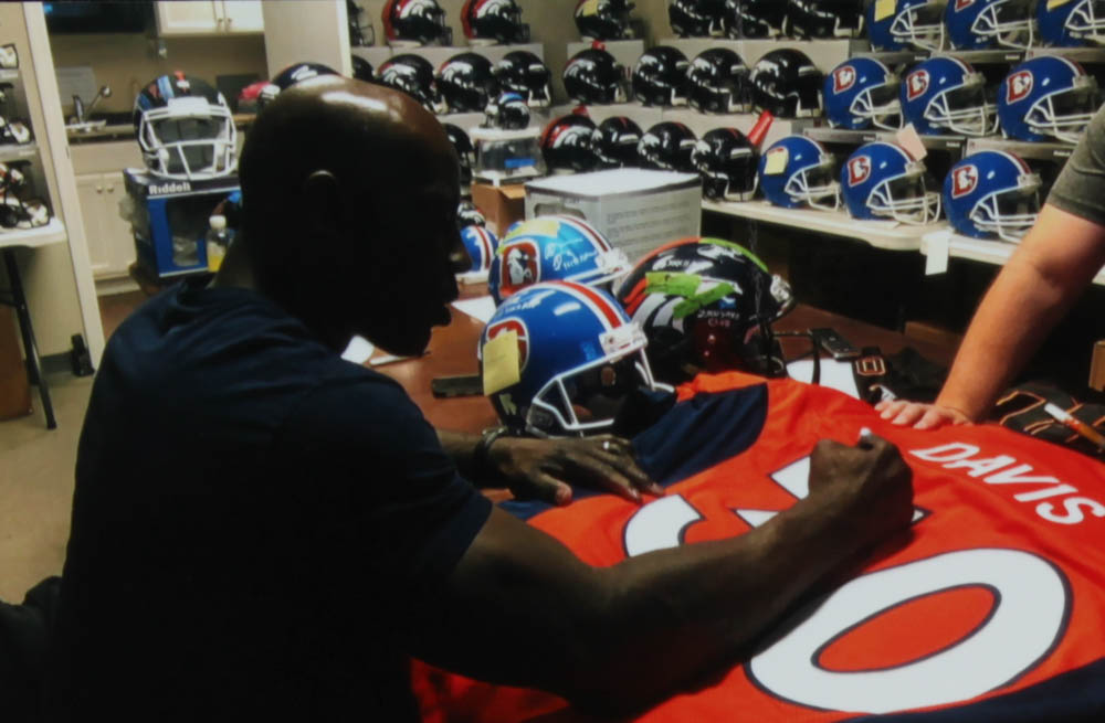 Custom on-field style jersey. Everything sewn on, size XL. Hand-signed by Terrell Davis (HOF).