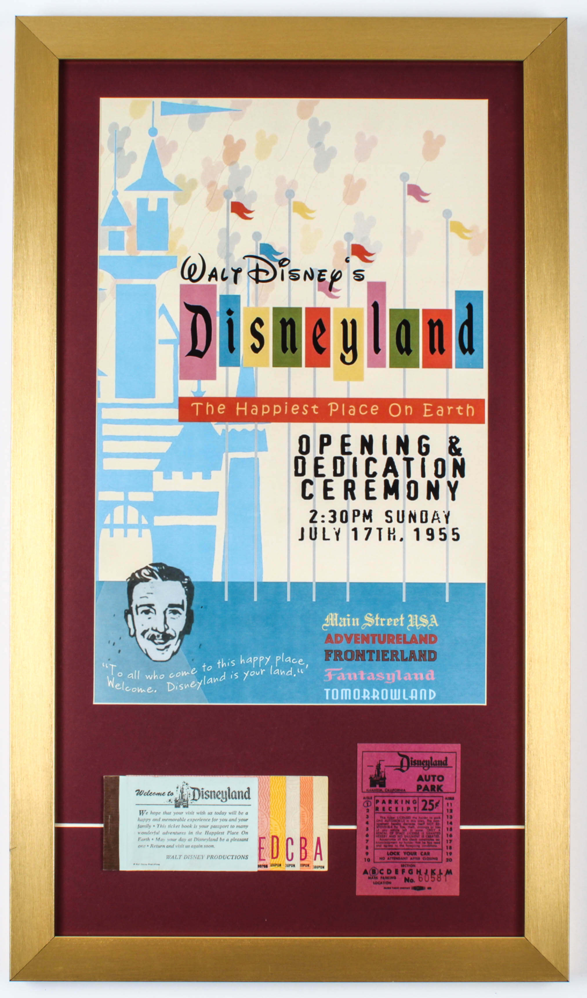 Walt Disney's Disneyland Opening Dedication Ceremony 15x26 Custom Framed Print Display With Vintage Ticket Book & 25¢ Parking Pass