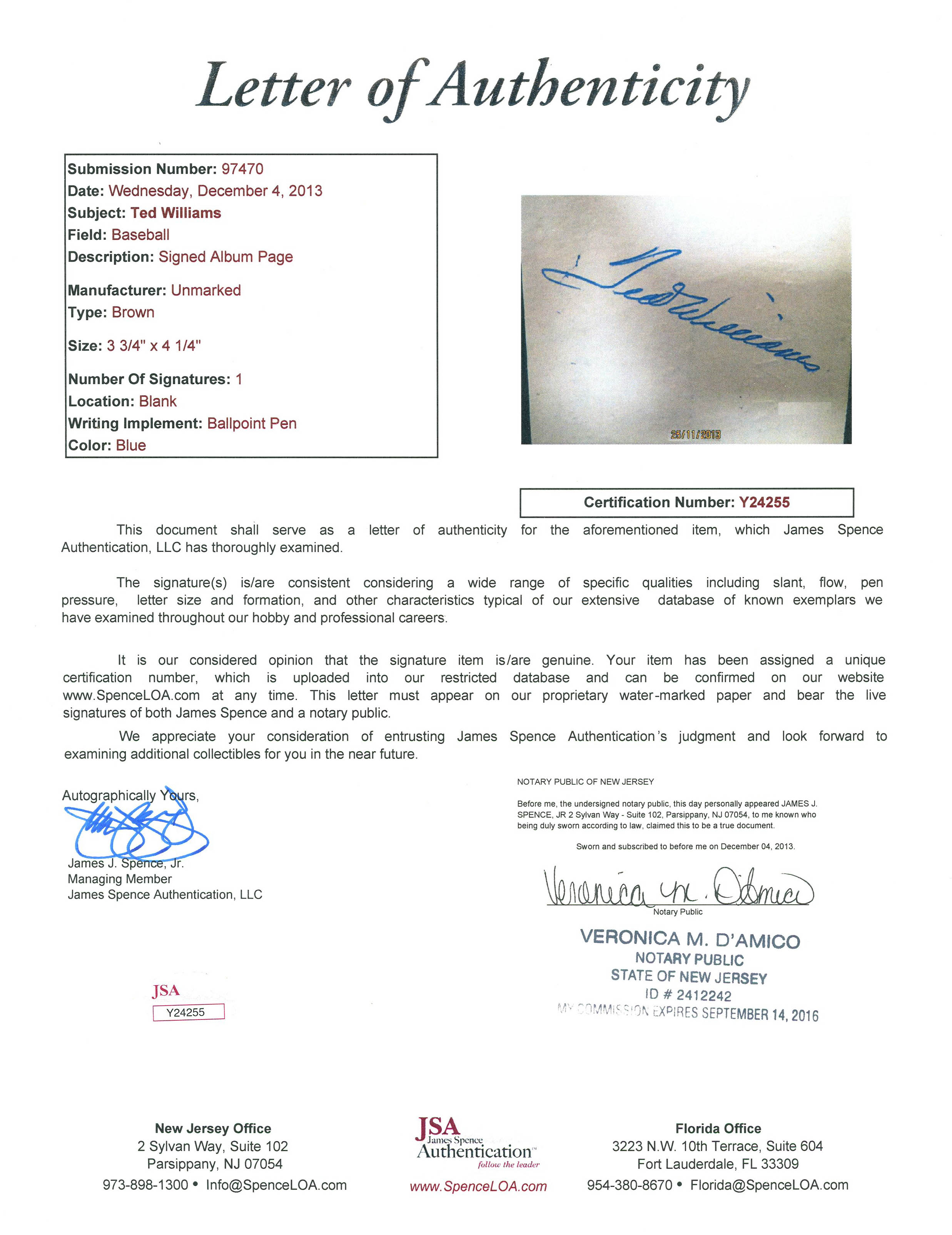Ted Williams Signed 4x4.5 Page Cut (JSA LOA)