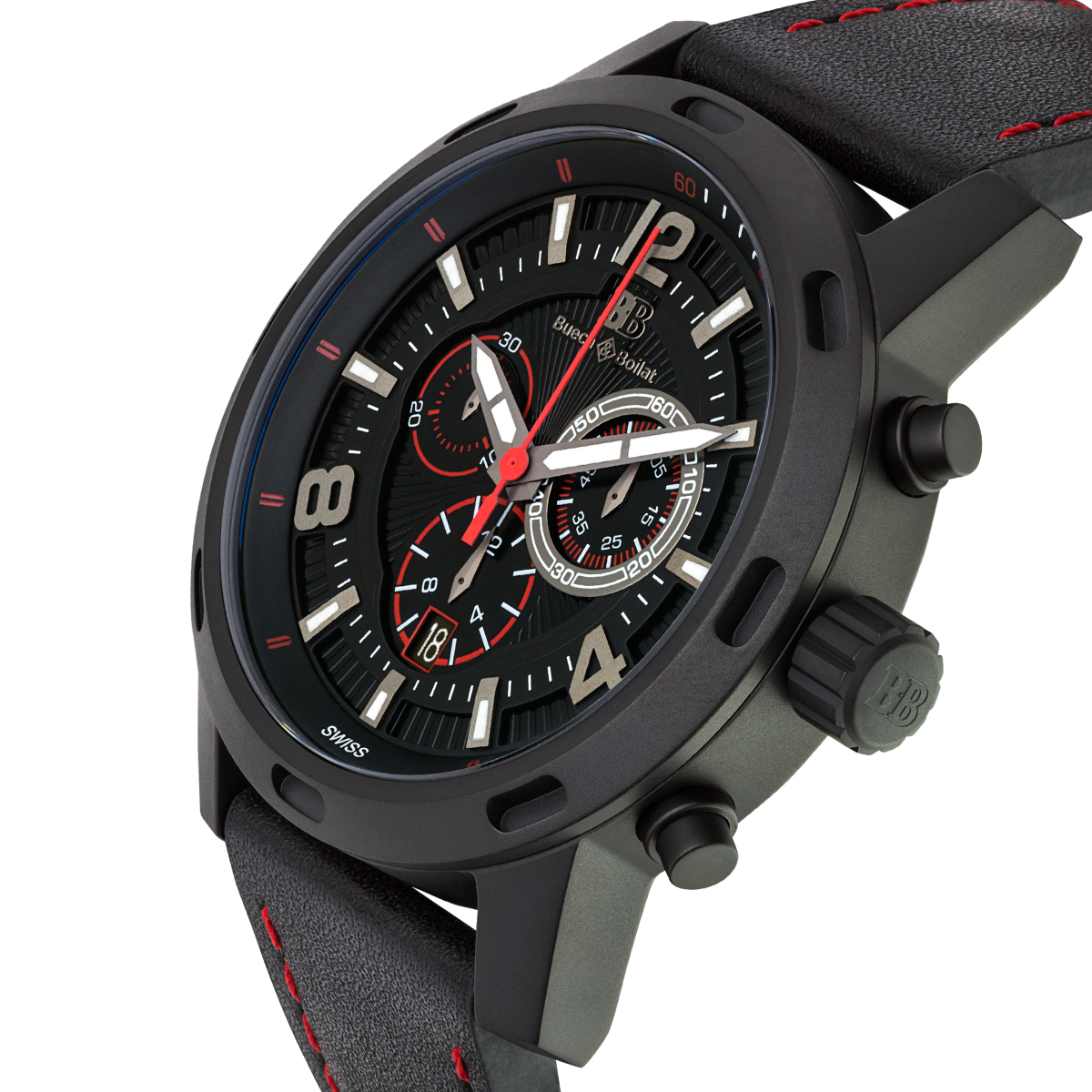 The Buech & Boilat Baracchi Men's Chronograph Watch features a black leather strap with red stitching, black dial, and a black case and red accents. Please see photos for details.