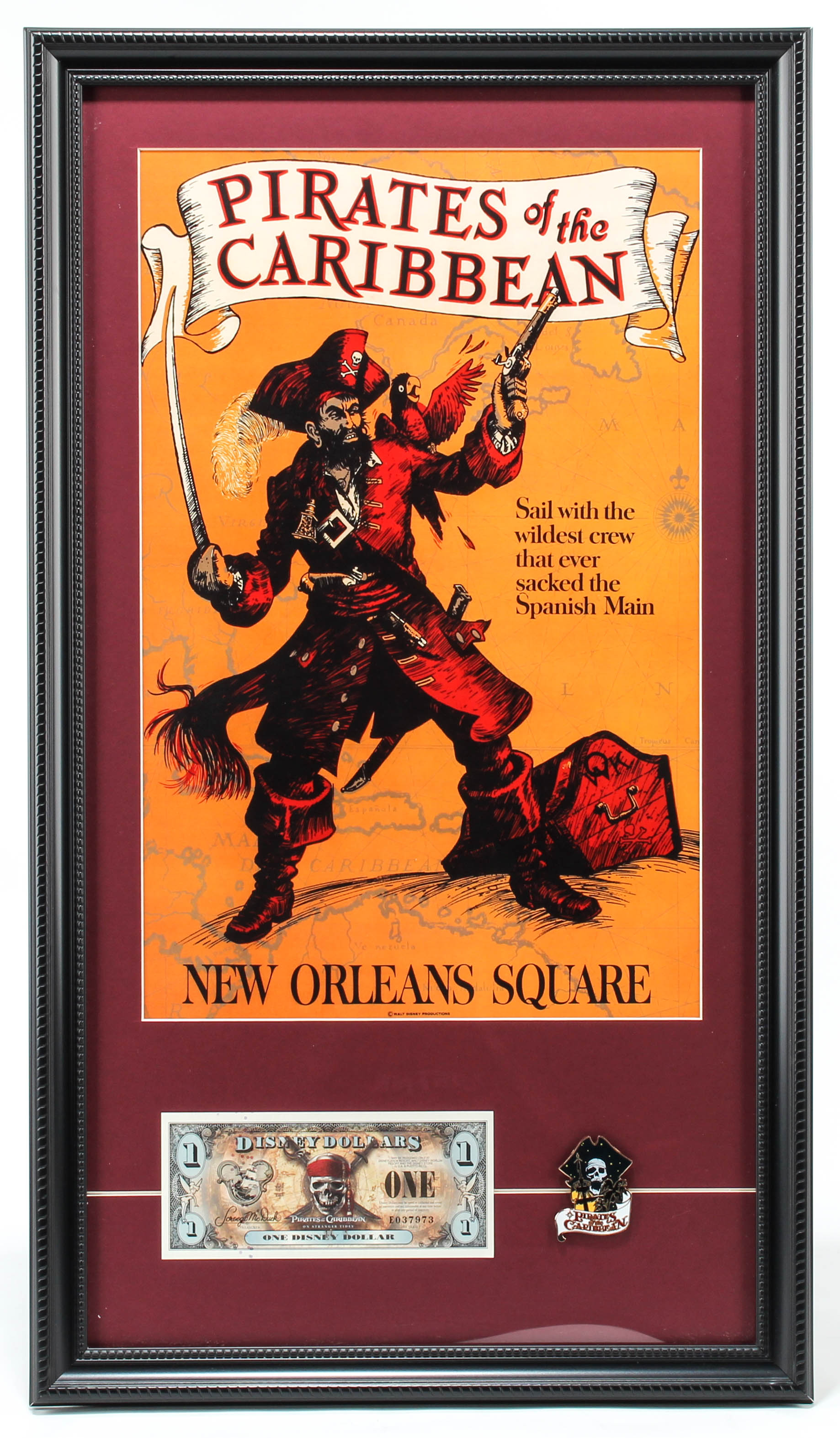 Disneyland "Pirates of the Caribbean" 15x26 Custom Framed Print with Pirates of the Caribbean Commemorative Dollar & Vintage Pirates Pin