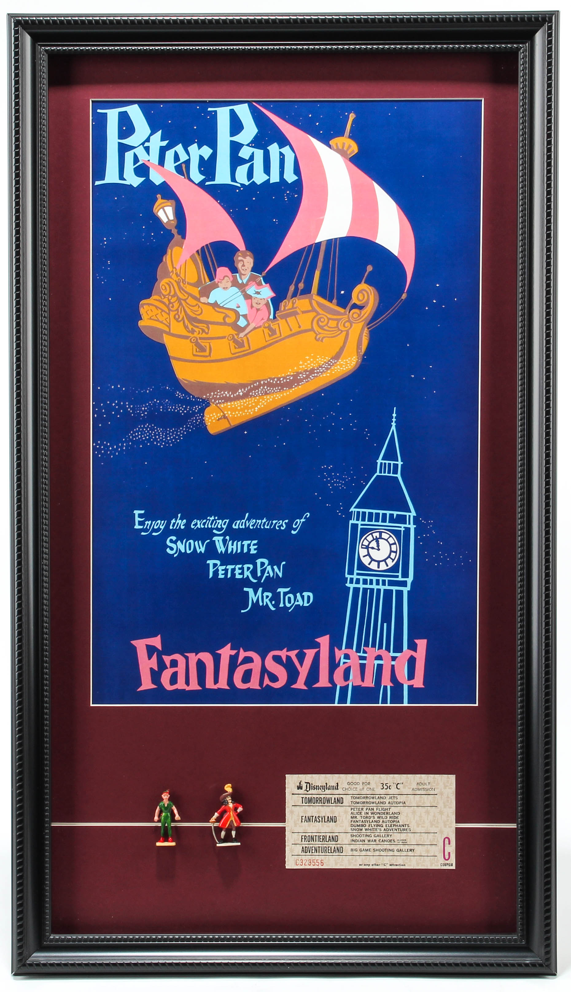 Custom framed poster display measures approximately 15" x 26" in size. The display features (2) Peter Pan figurines and vintage ride ticket.