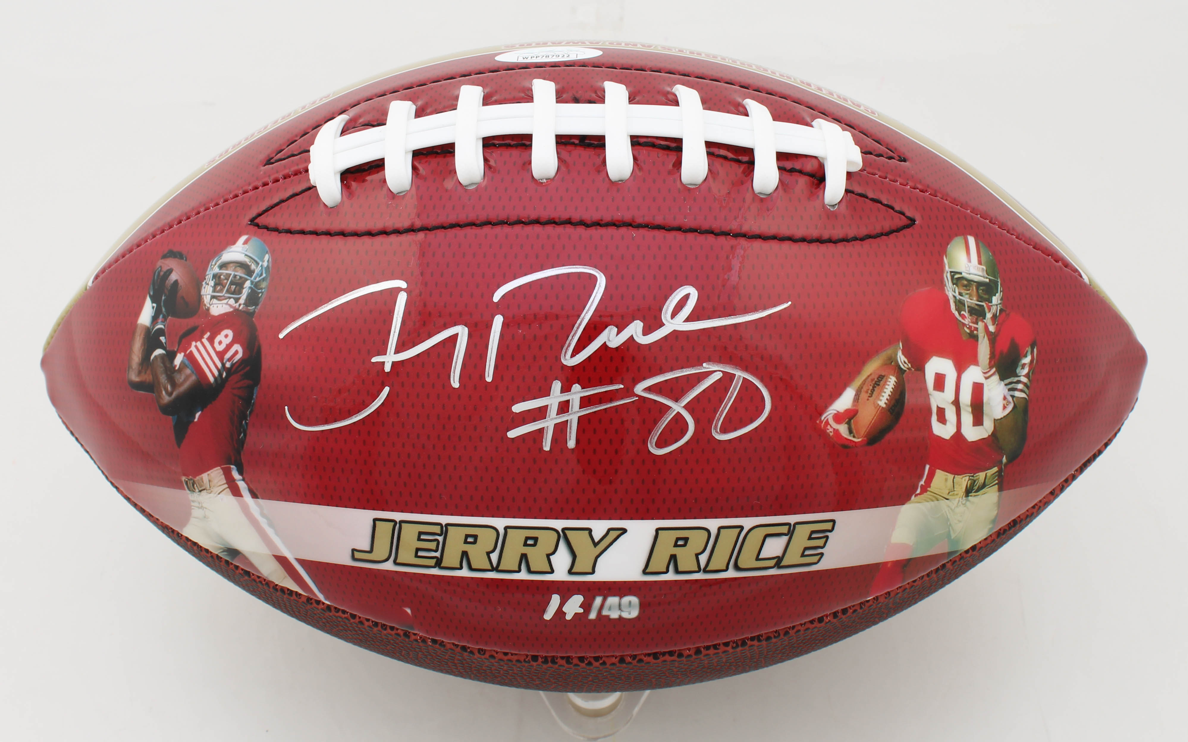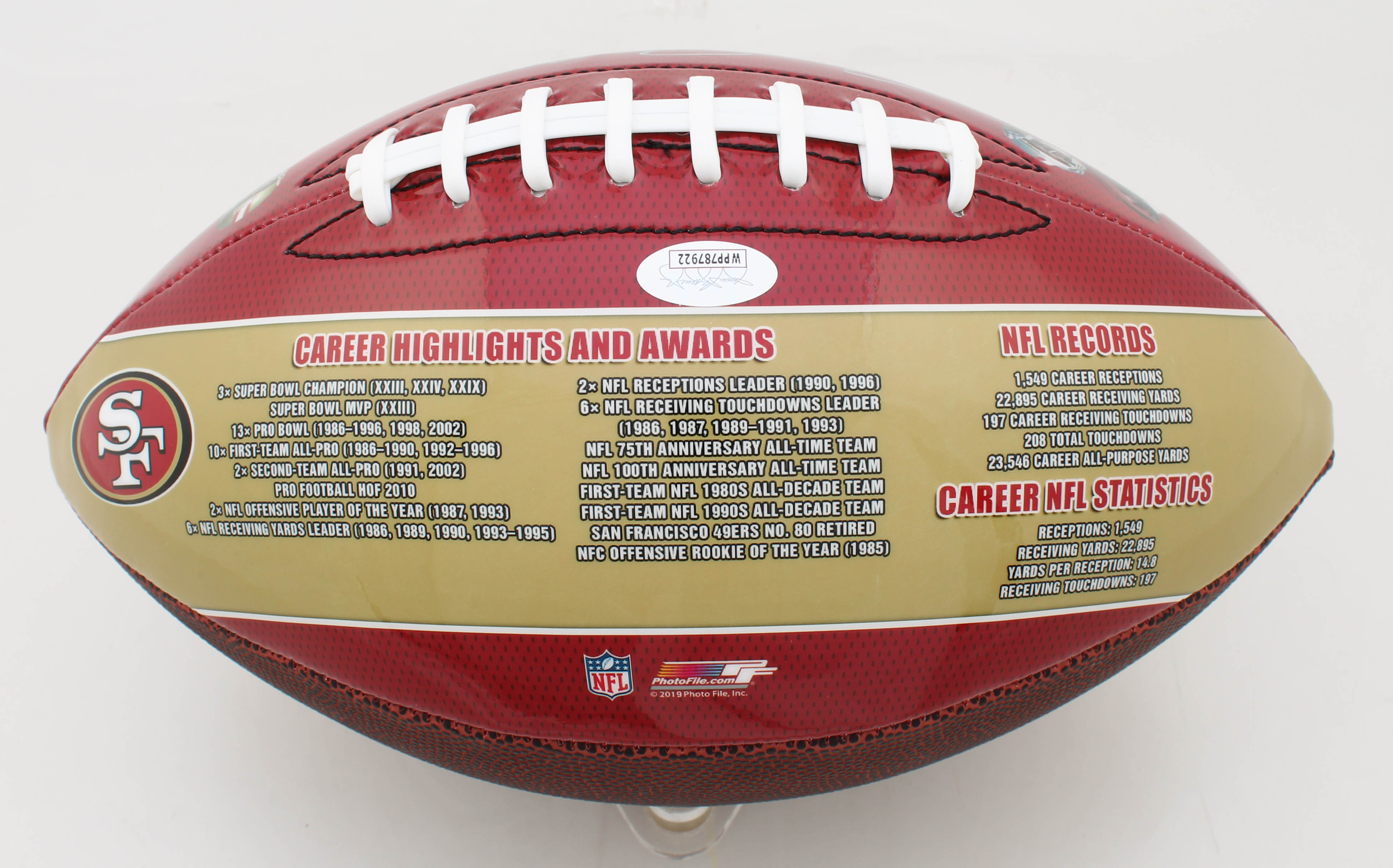 San Francisco 49ers official Jerry Rice Career Stat Highlight football. Hand-signed by Jerry Rice (HOF). Randomly hand-numbered limited edition #/49.