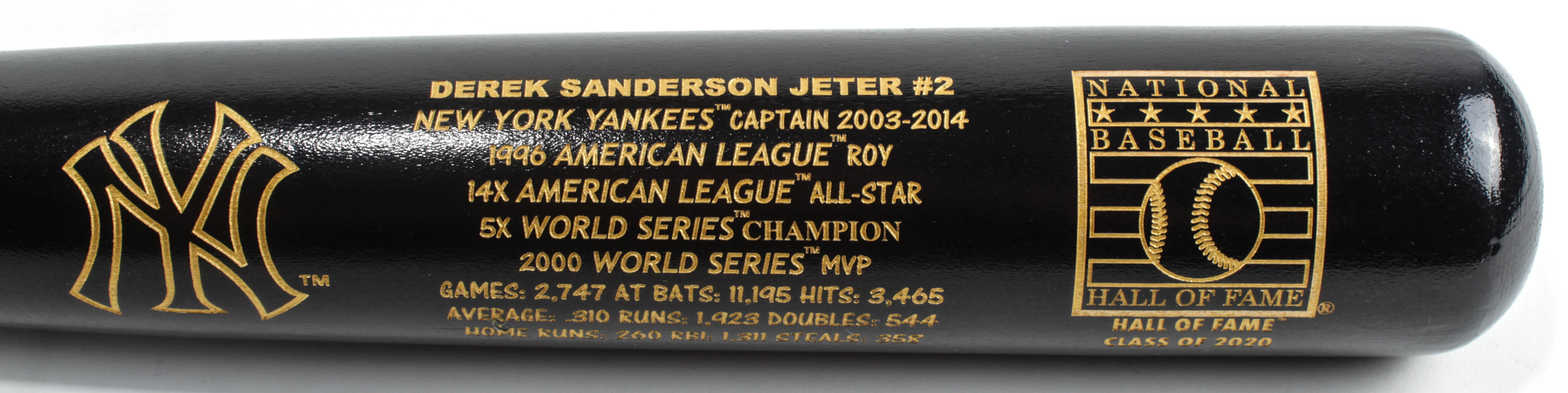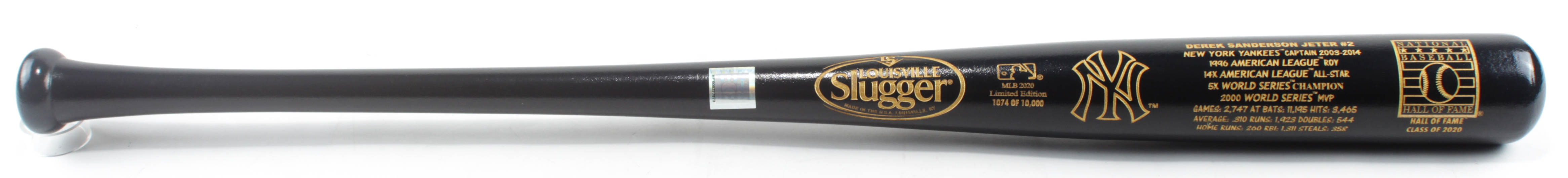 Louisville Slugger custom engraved baseball bat features a commemorative engraving of Derek Jeter's New York Yankees career stats. The bat is limited edition and has been numbered #1,074/10,000. Please note, the bat is unsigned.