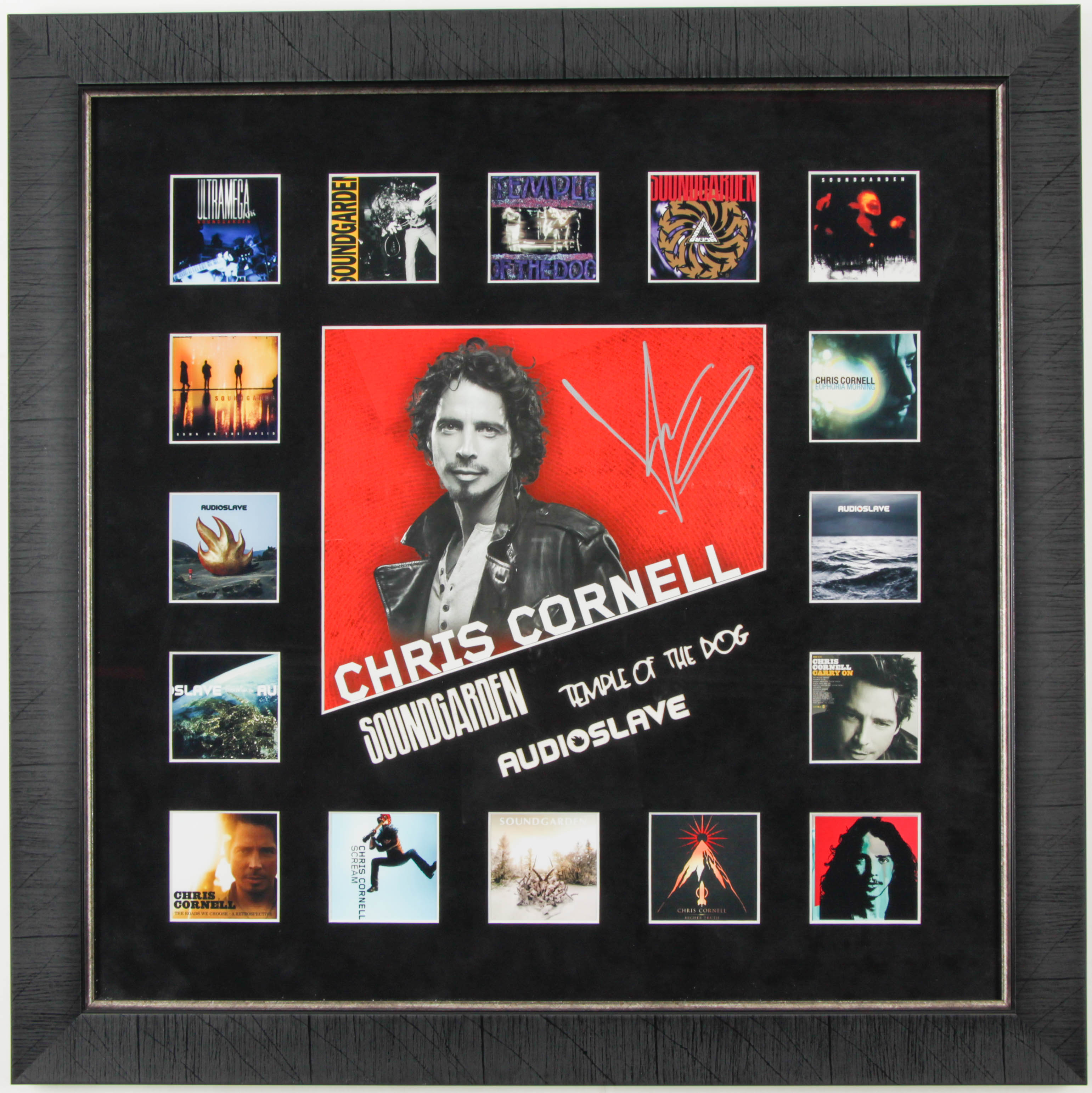 Frame measures 25" x 26" in size and is hand-signed by Chris Cornell (D. 2017). Please see photos for details.