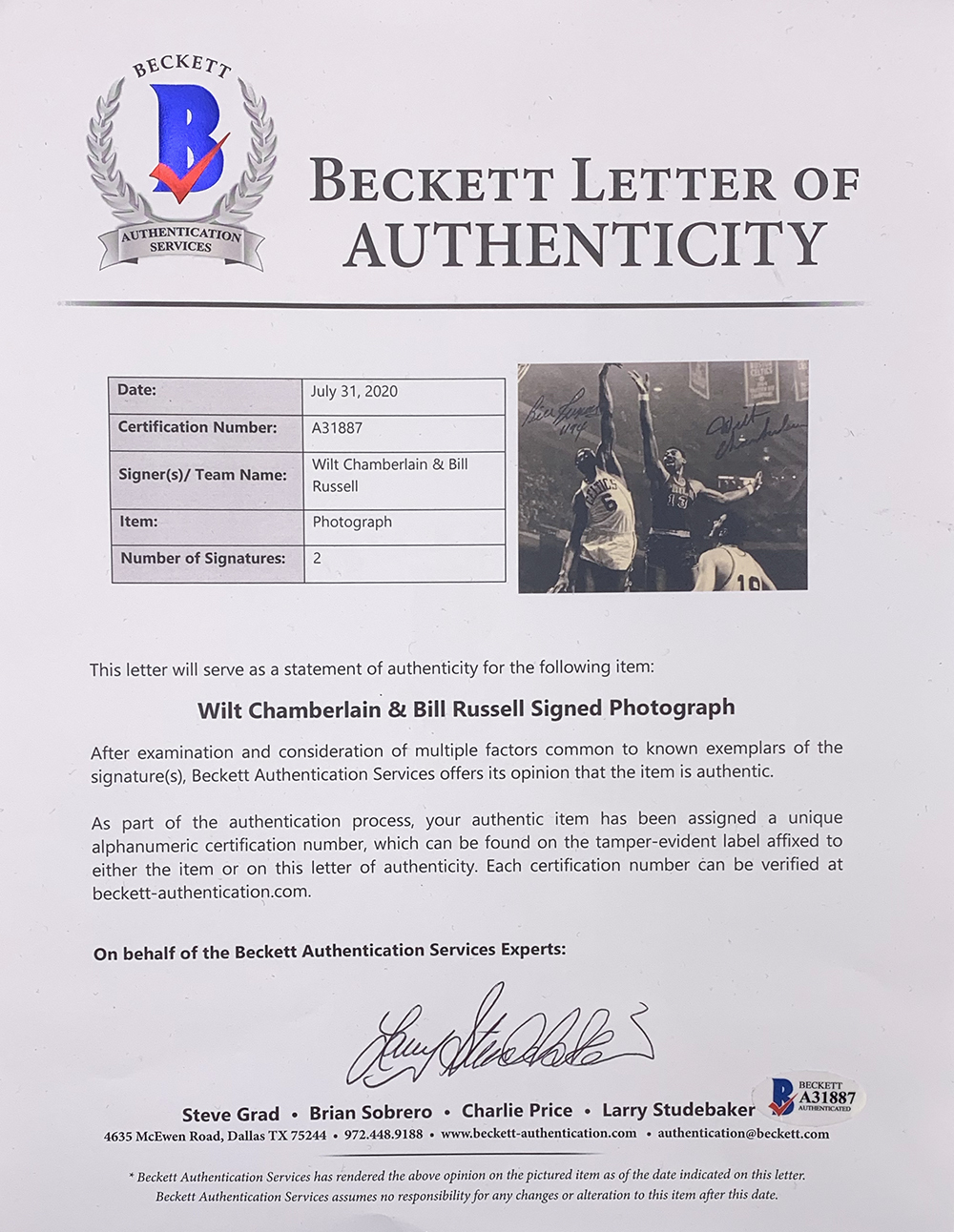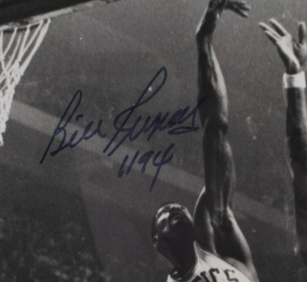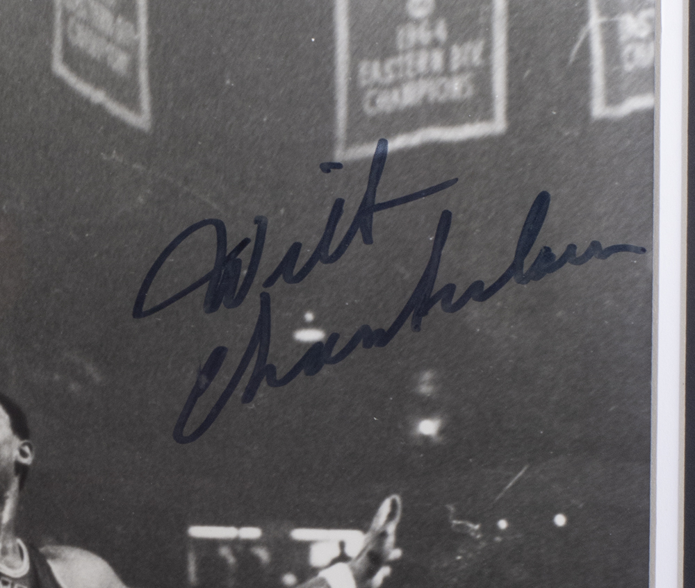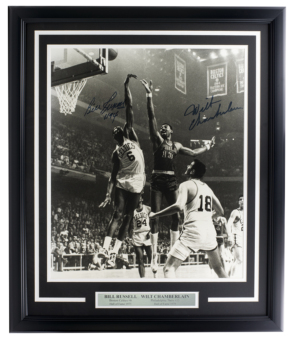 Framed display measures 22" x 27" in size and features a photo that has been hand-signed by Bill Russell (Boston Celtics, HOF) and Wilt Chamberlain (Philadelphia 76ers, HOF).