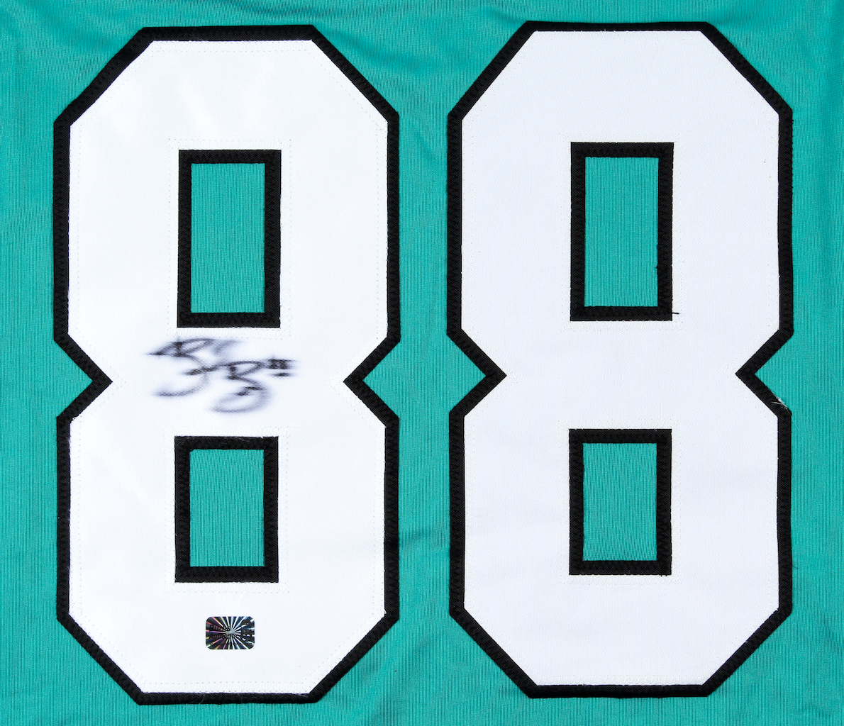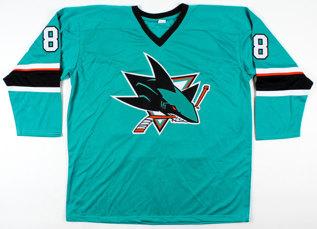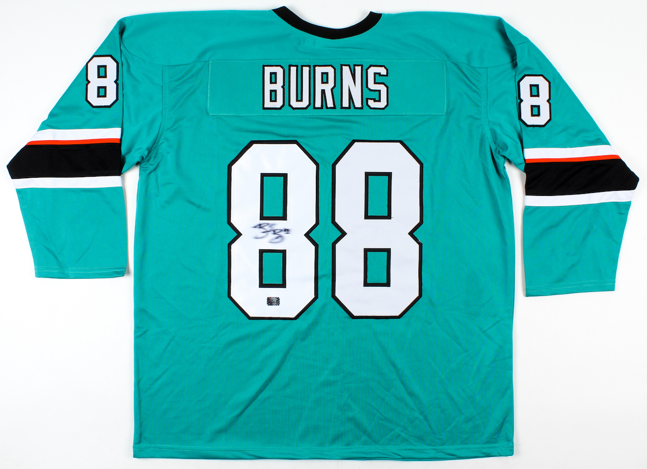 Custom on-ice style jersey. Everything is sewn on, size XL. Hand-signed by Brent Burns.