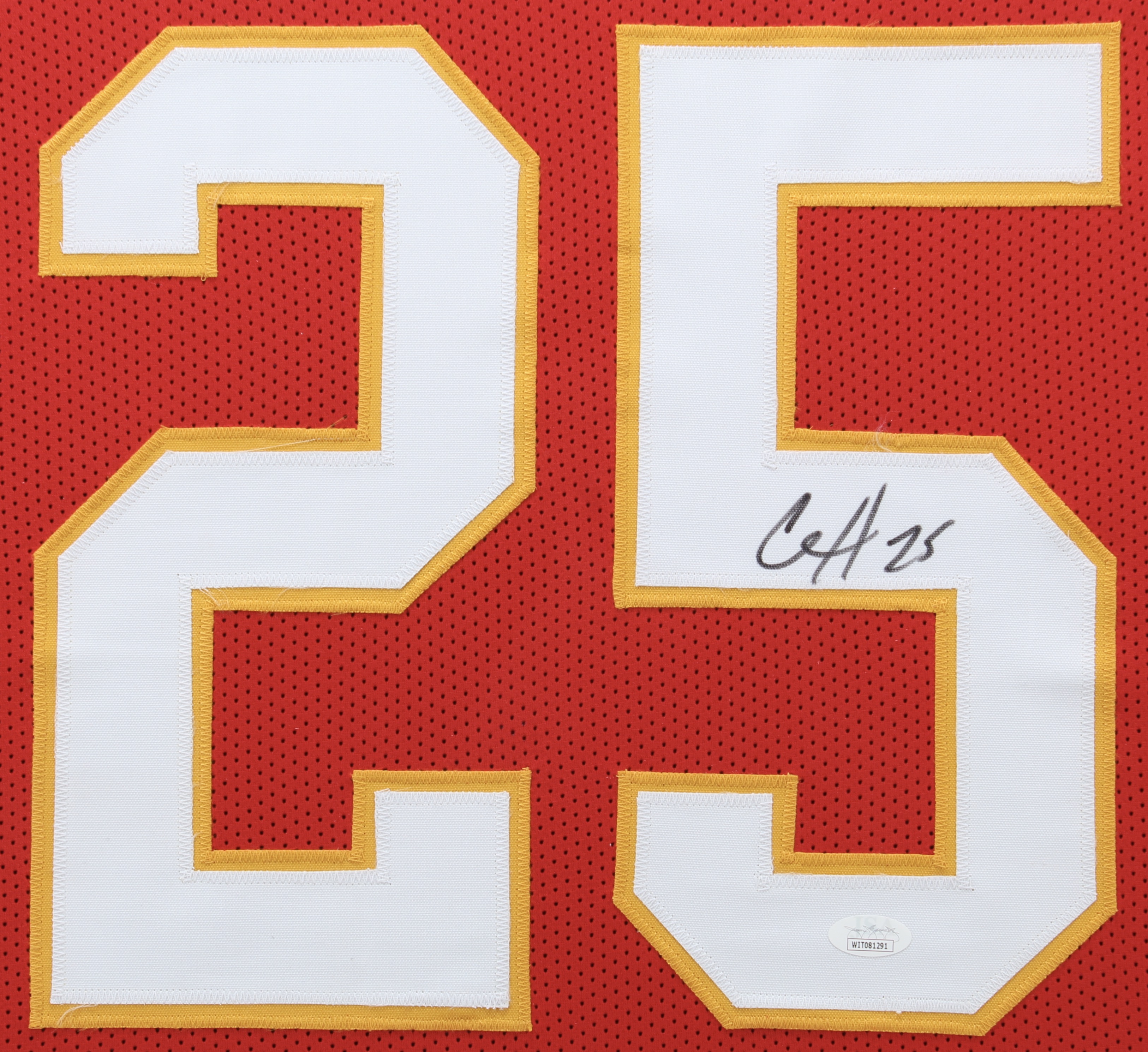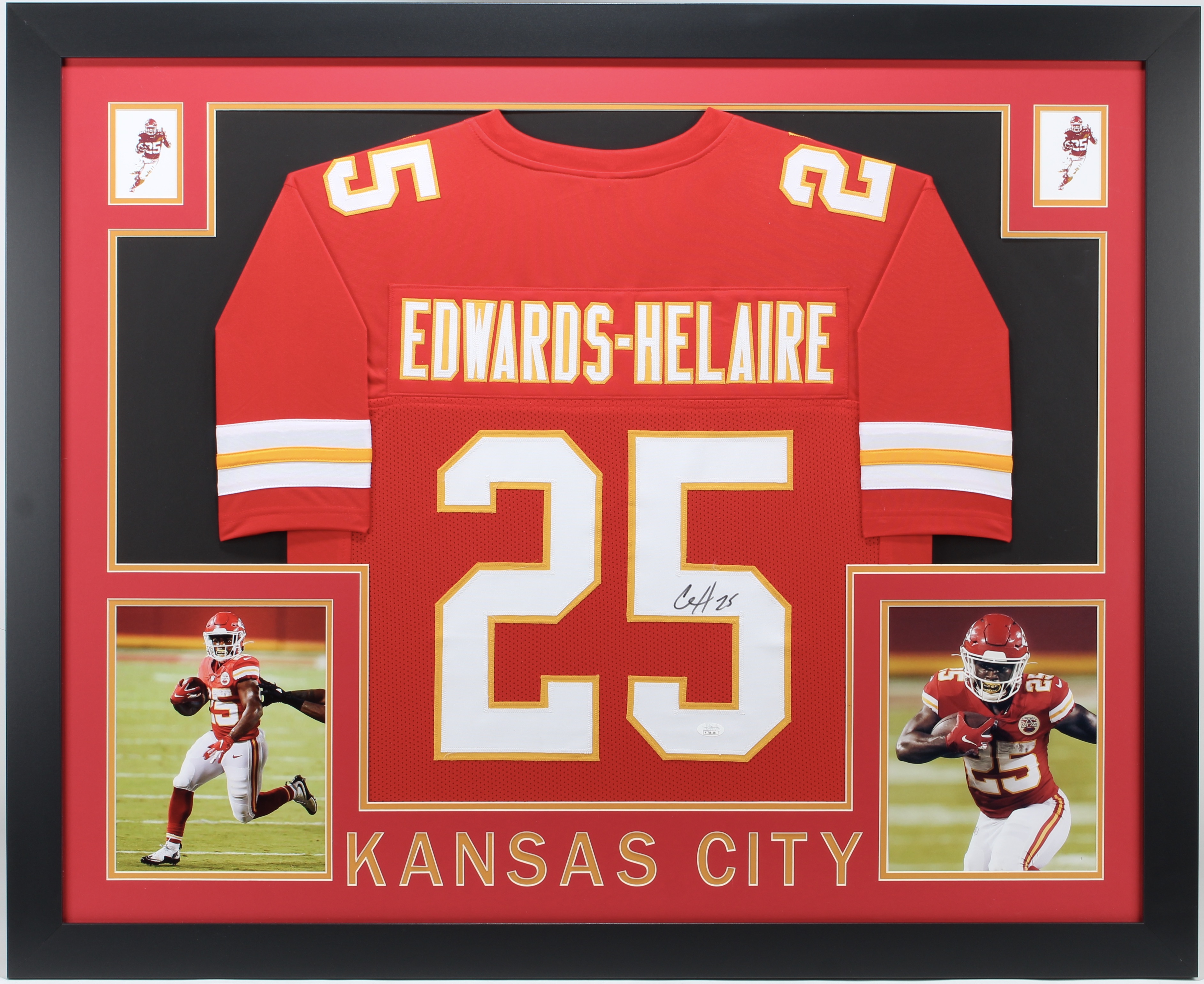 Custom frame measures approximately 35" x 43" in size and features a custom on-field style jersey that has been hand-signed by Clyde Edwards-Helaire.
