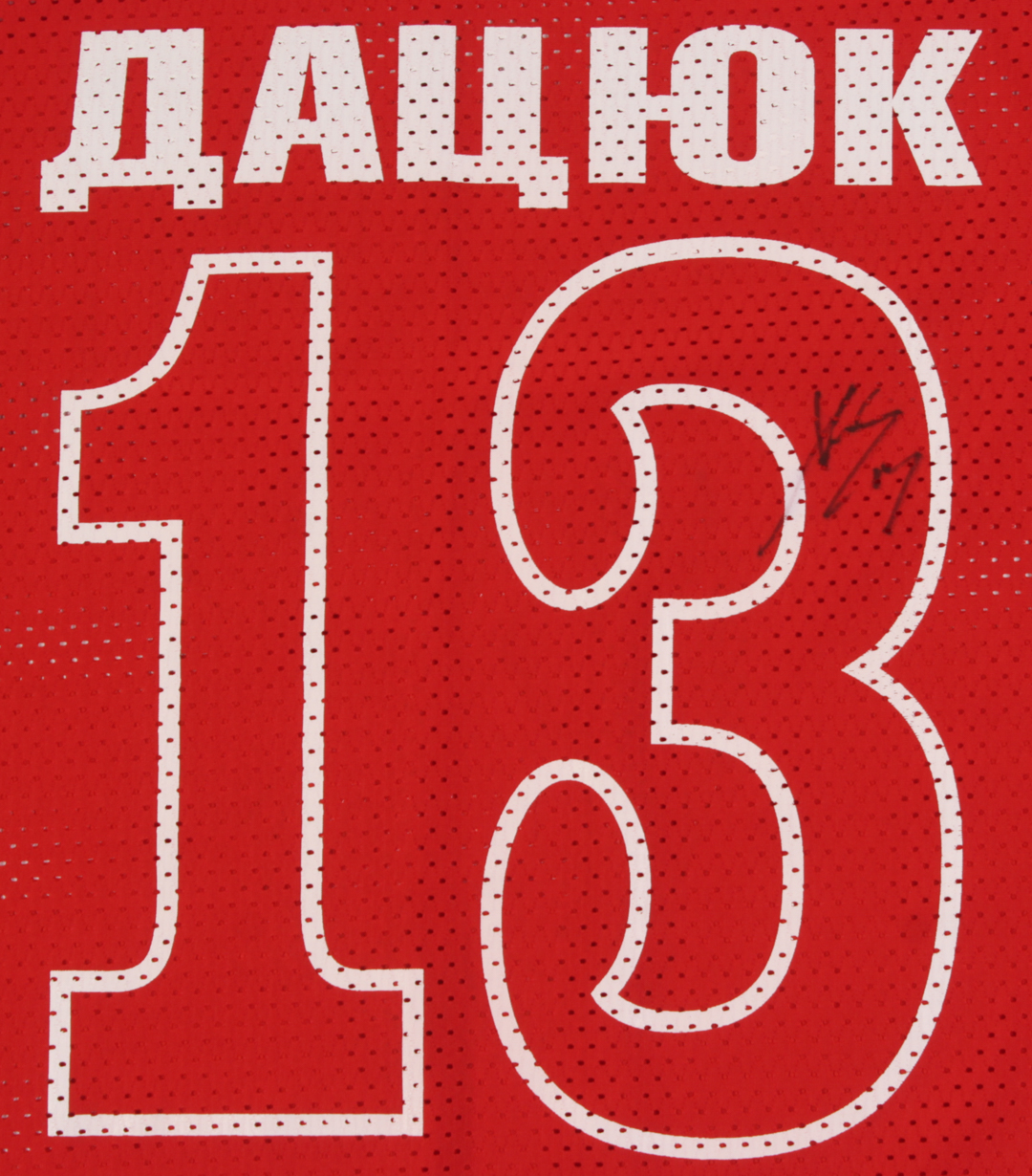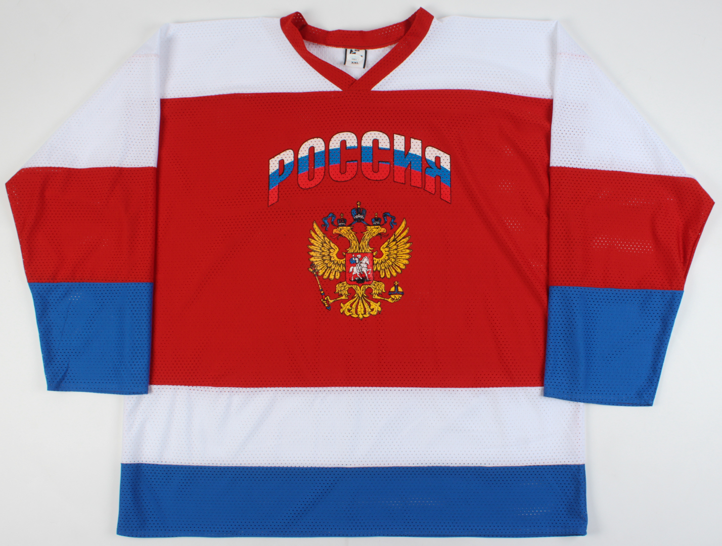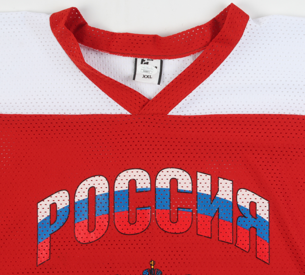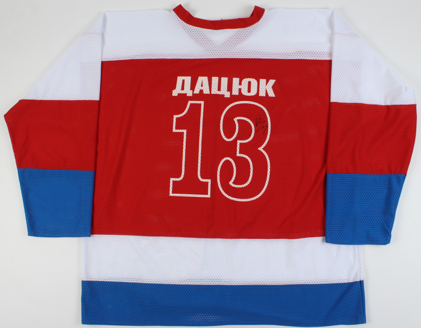 Custom on-ice style jersey. Everything printed on, size XXL. Hand-signed by Pavel Datsyuk.