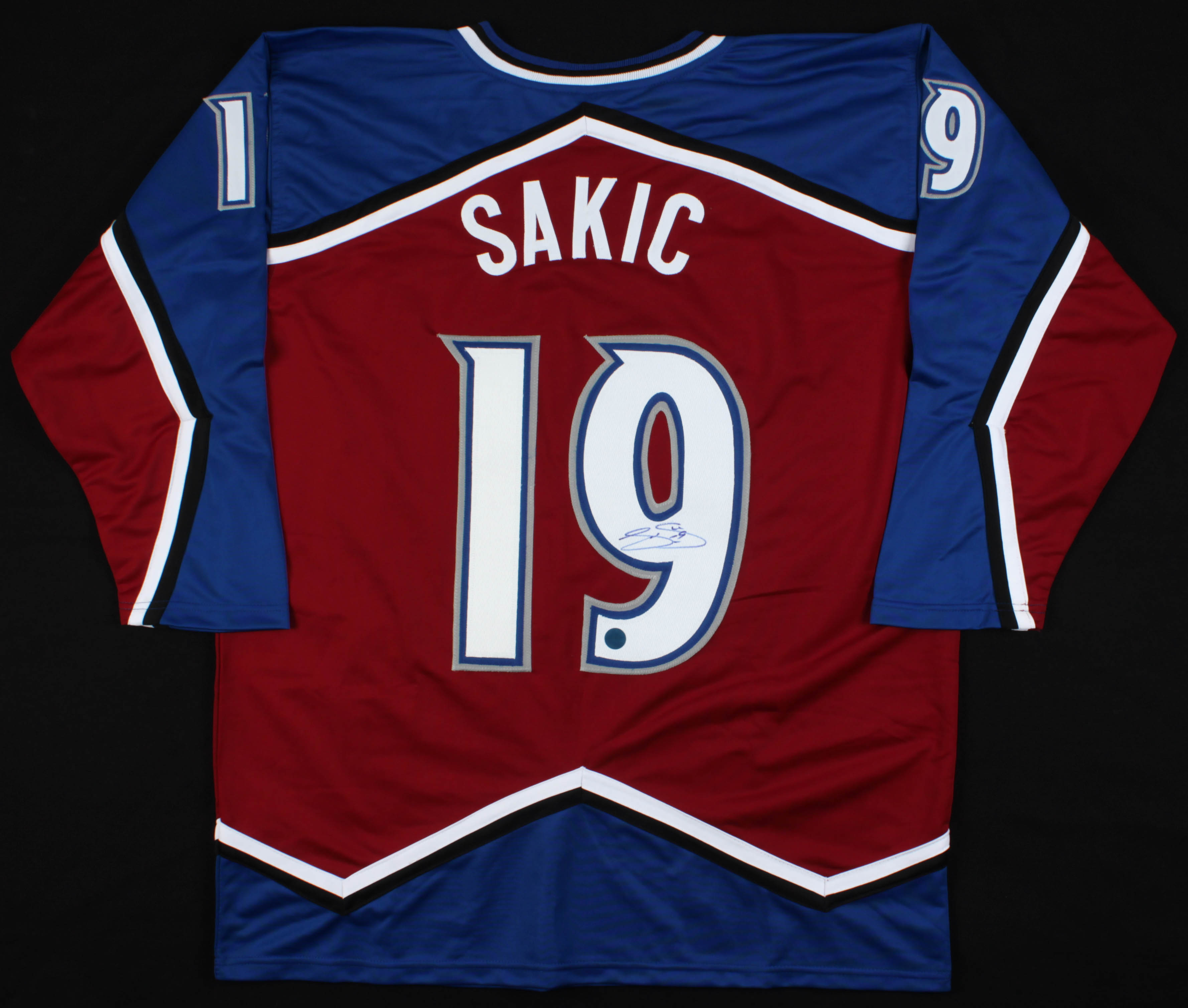 Custom on-ice style jersey. Everything is sewn on, size XL. Hand-signed by Joe Sakic (HOF).