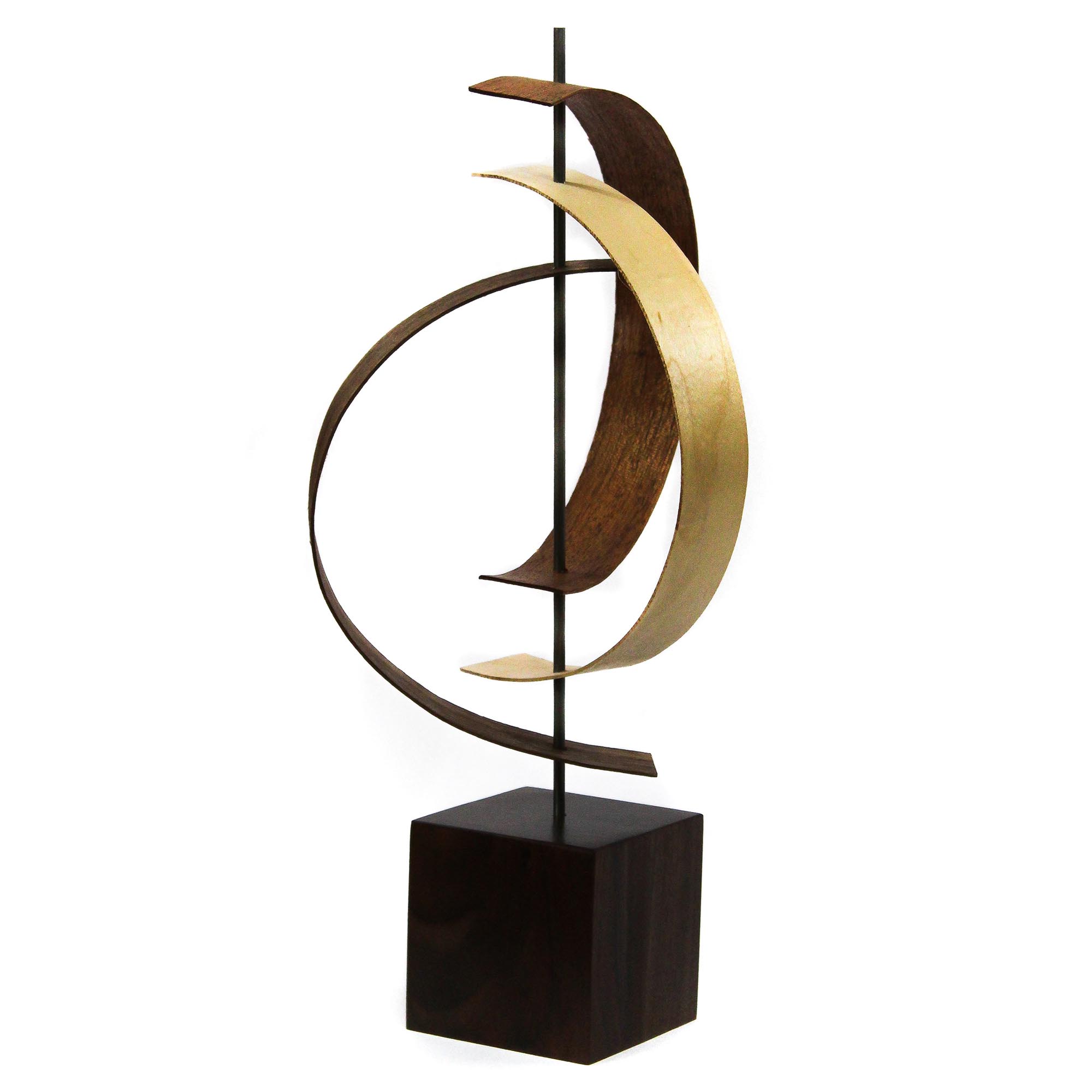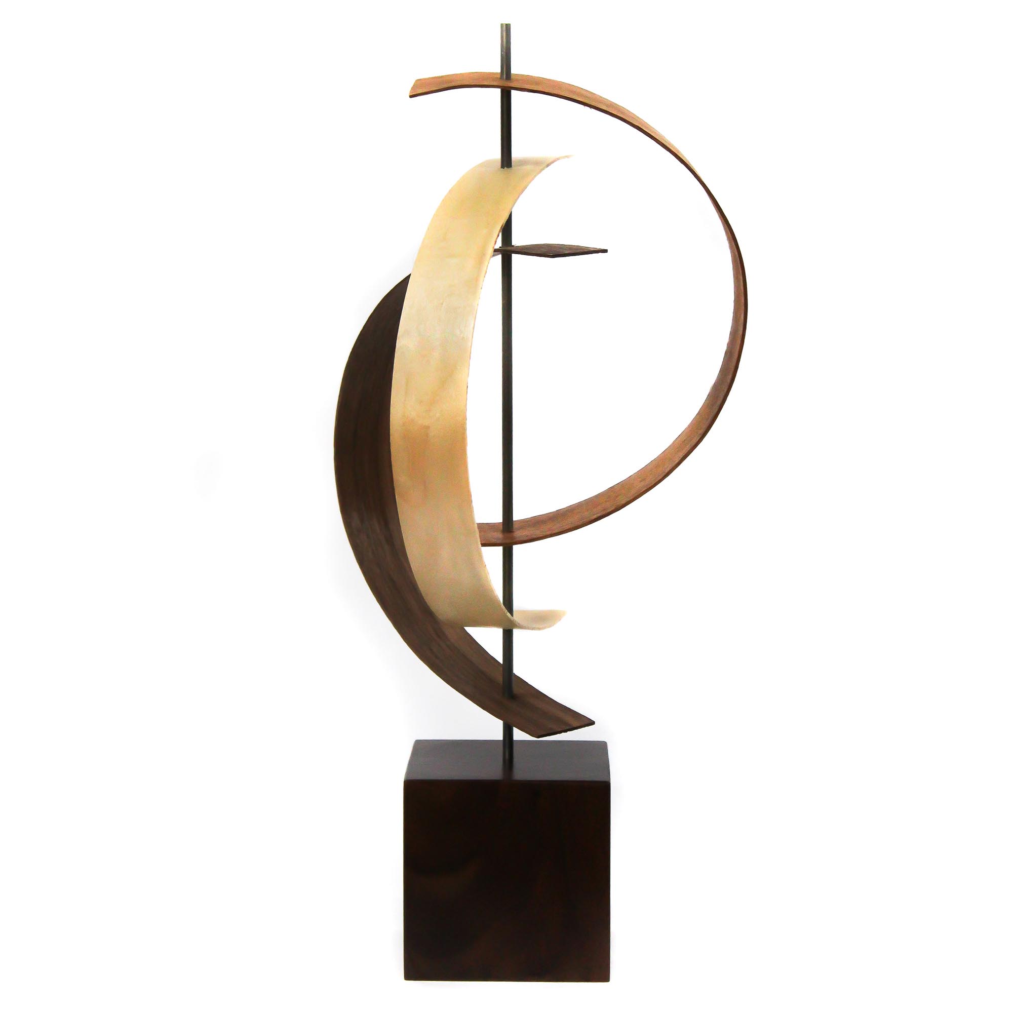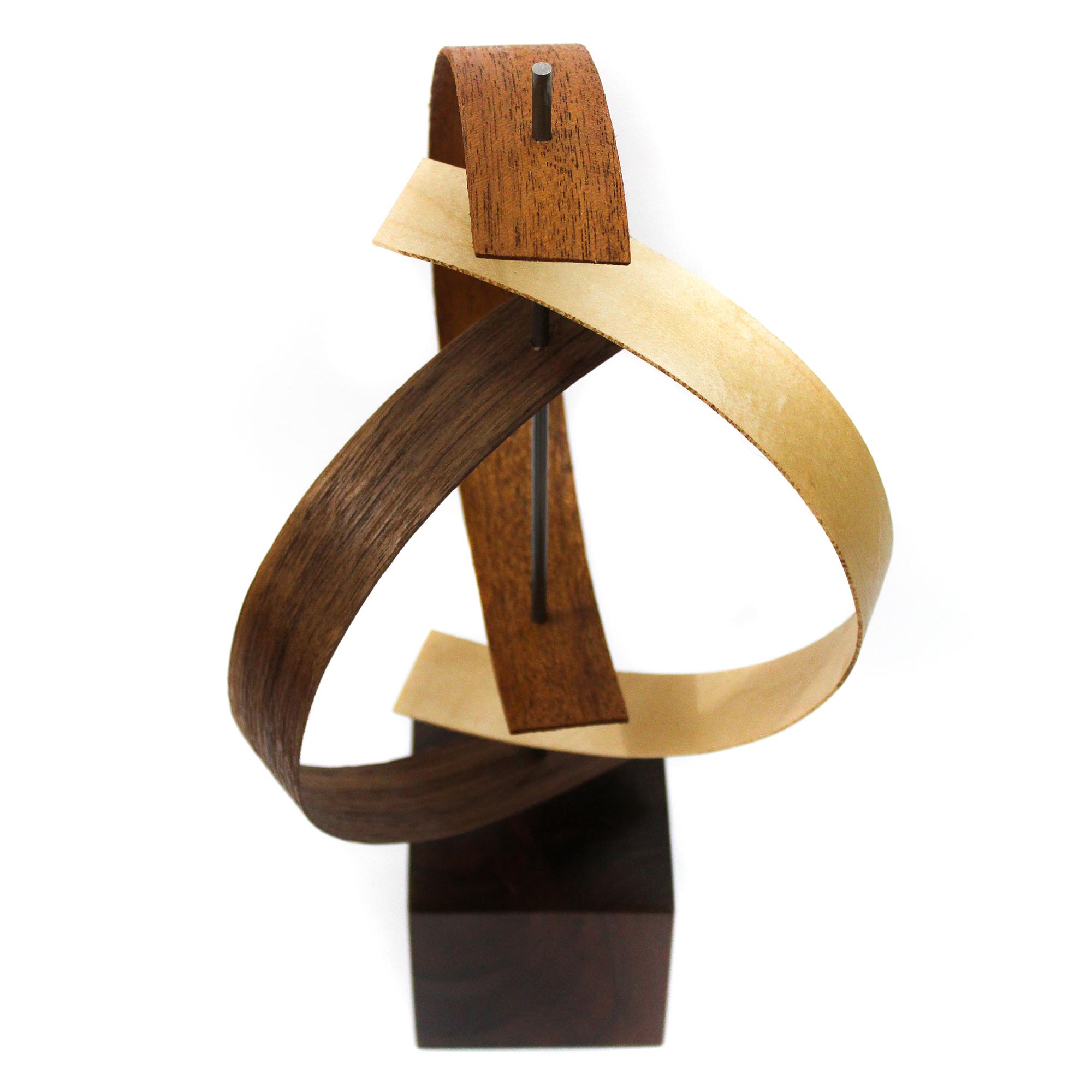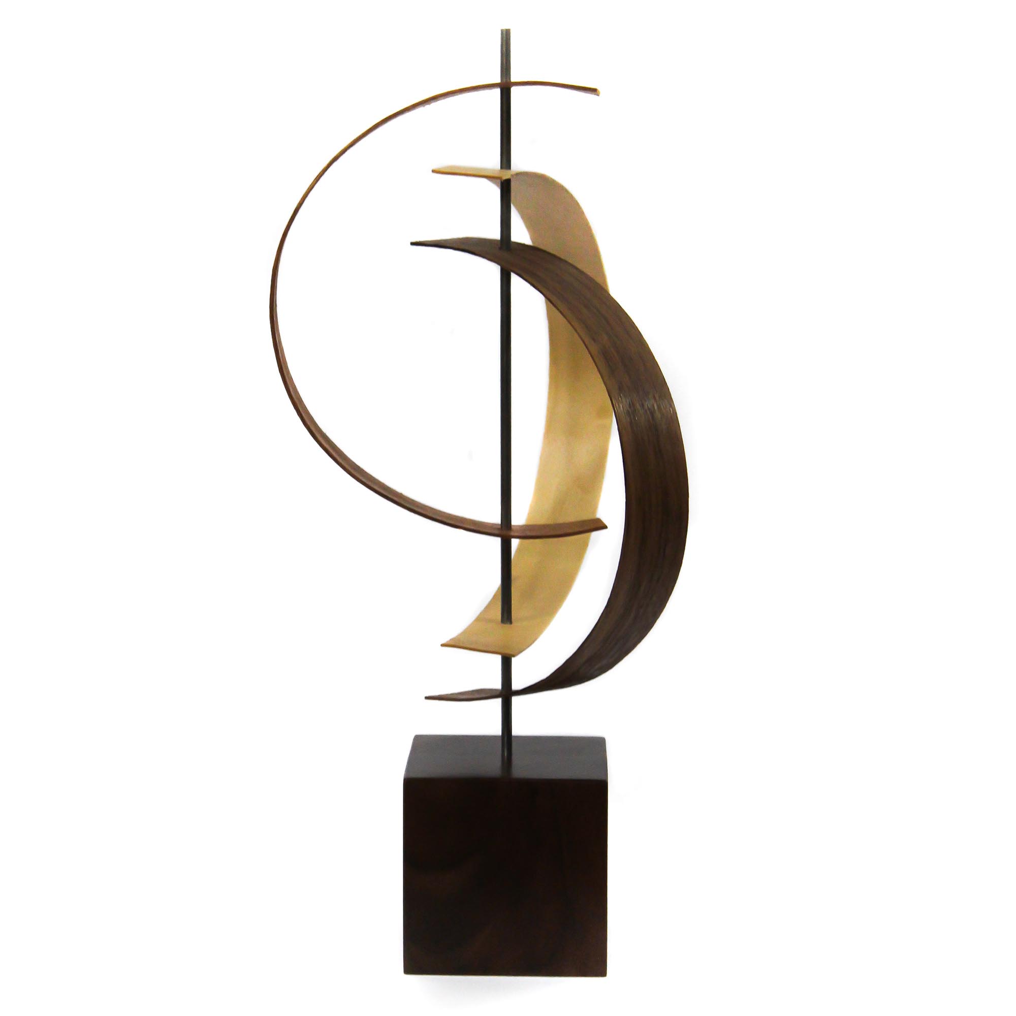 With the 'Origin' solid wood sculpture you introduce a warm selection of natural hardwoods into your space, with a gorgeous contemporary twist. It is a brilliant 16 inch tall free-standing sculpture with a sense of elegance and weightlessness that will elevate your ambience and introduce a new level of sophistication and class. The broad curves and natural wood and metal tones give it a mid-century vibe. This modern wood sculpture is hand-crafted by Jackson Wright in Cincinnati, Ohio, with each piece featuring unique nuances due to the variations in grain, character, and hue of the natural woods. The body and base are built from hand-selected hard woods and materials in rich, attractive hues of black walnut, cherry, poplar, and beige. The wood slats are steam bent to shape and mounted to a steel rod, and the sculpture is sealed with two coats of semi-gloss lacquer finish.