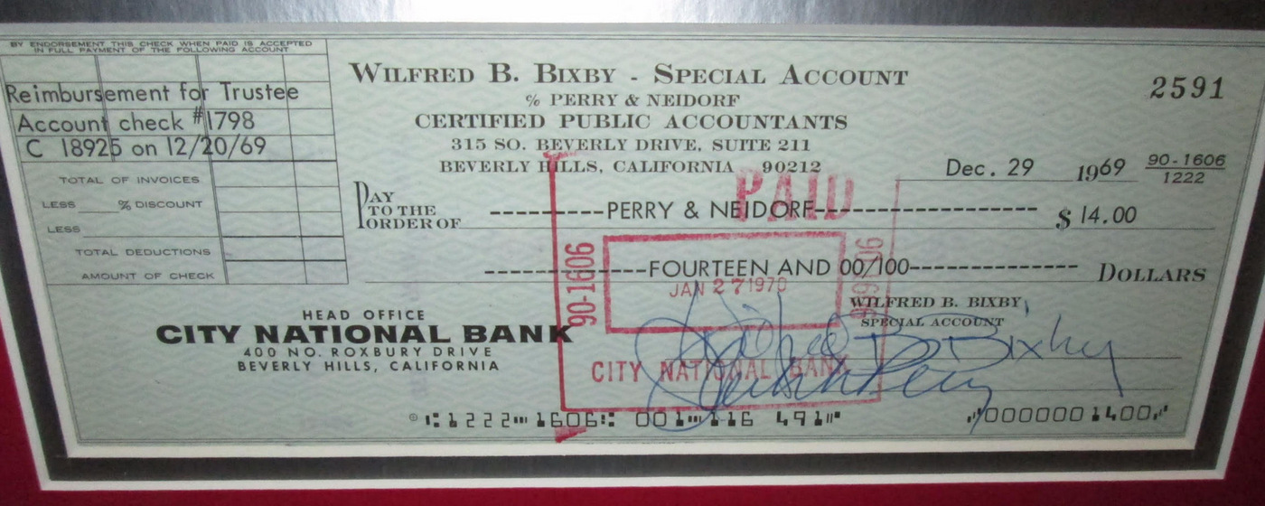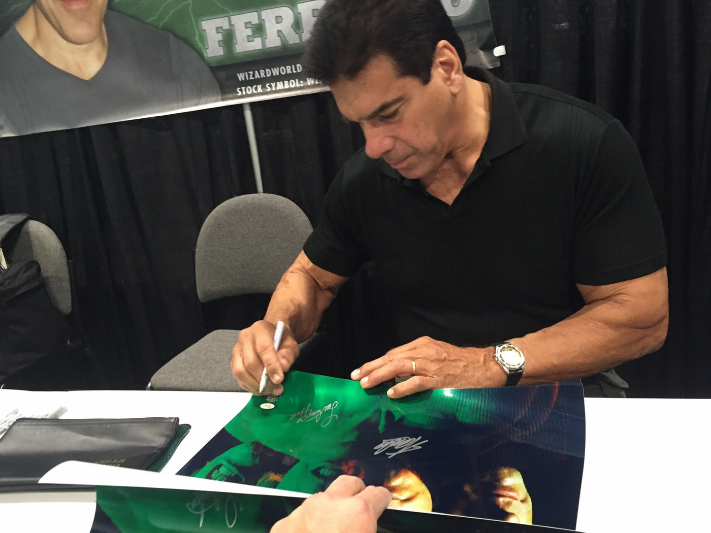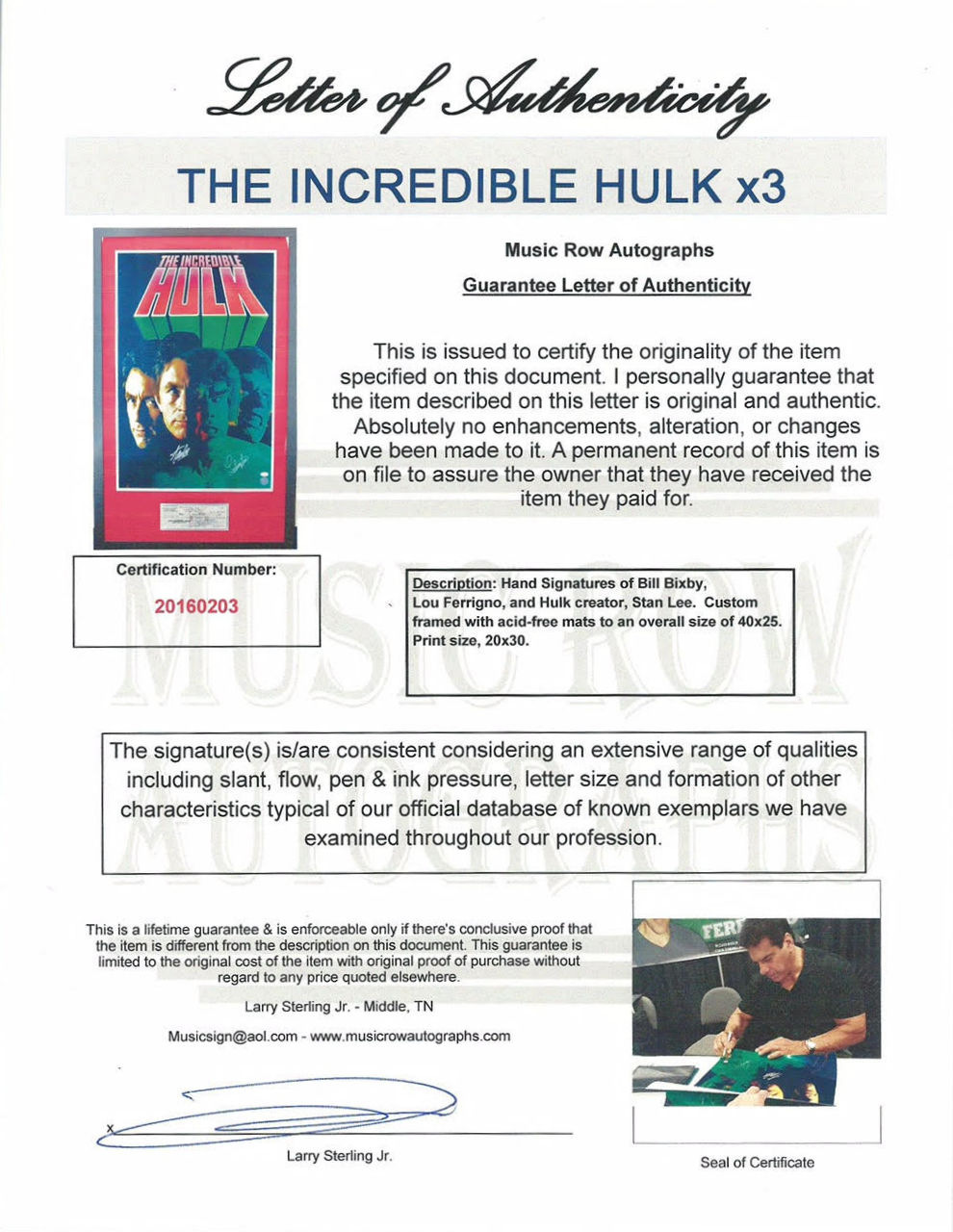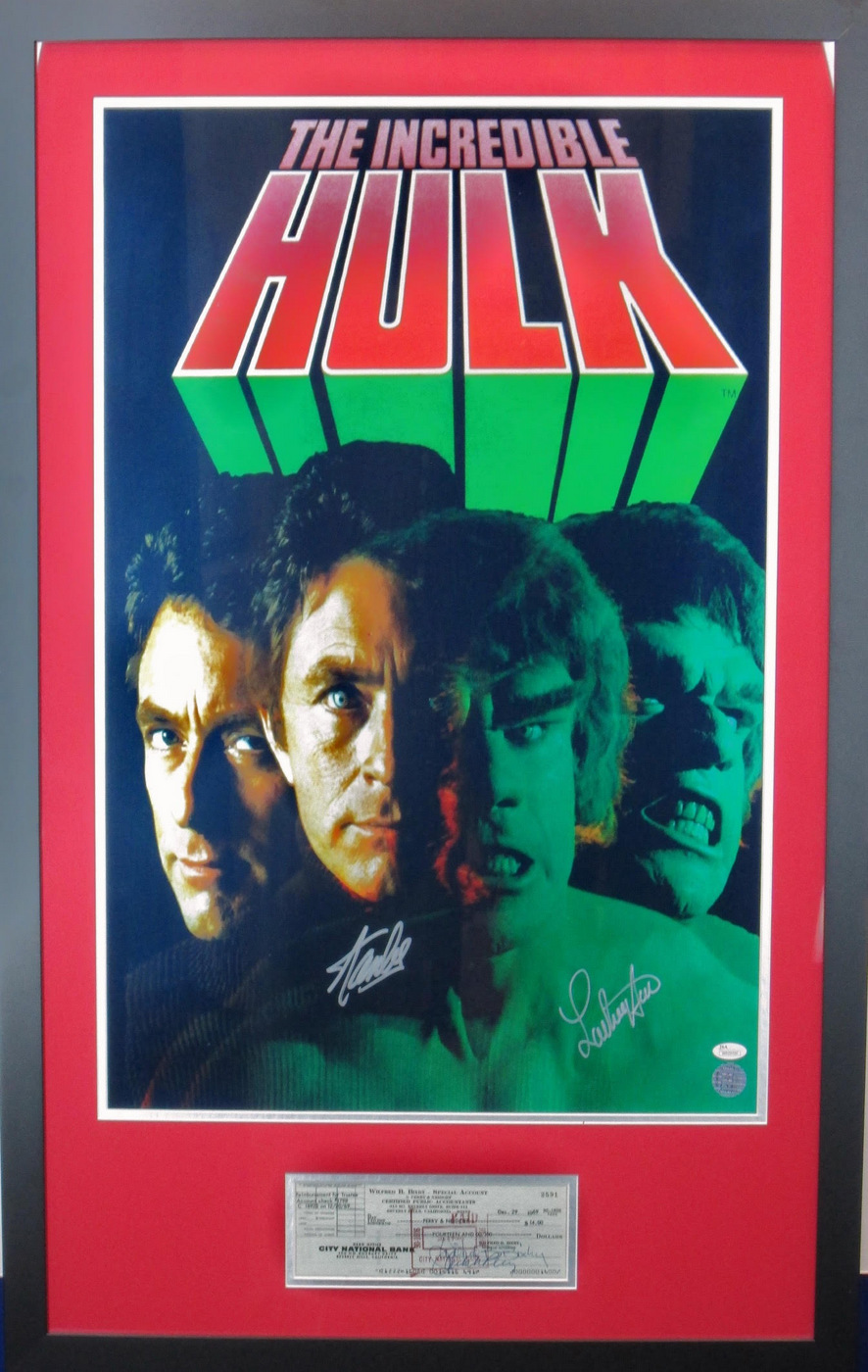 Custom framed with acid-free mats to an overall size of 25" x 40". Features a 20" x 30" photo which has been hand-signed in silver paint pen by Lou Ferrigno and Stan Lee (Marvel Comics). Also features a canceled personal check hand-signed in blue ink pen by Bill Bixby (D 1993).