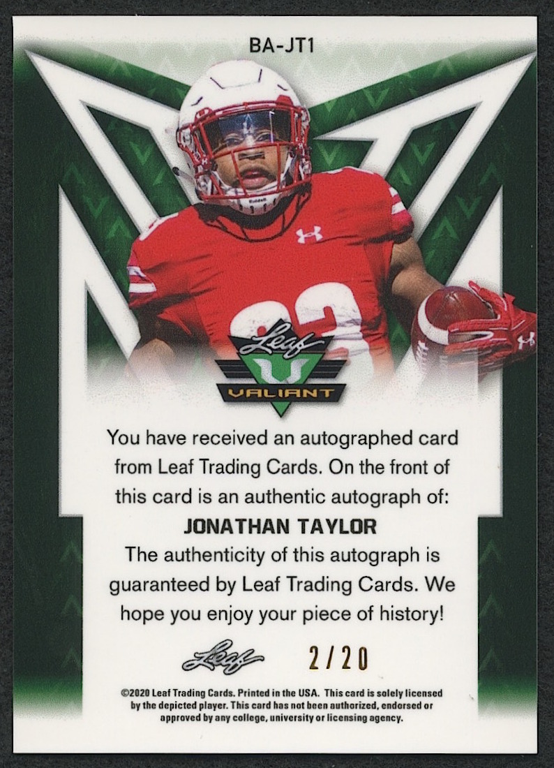 Jonathan Taylor 2020 Leaf Valiant Purple #BAJT1 Autograph RC #2/20
