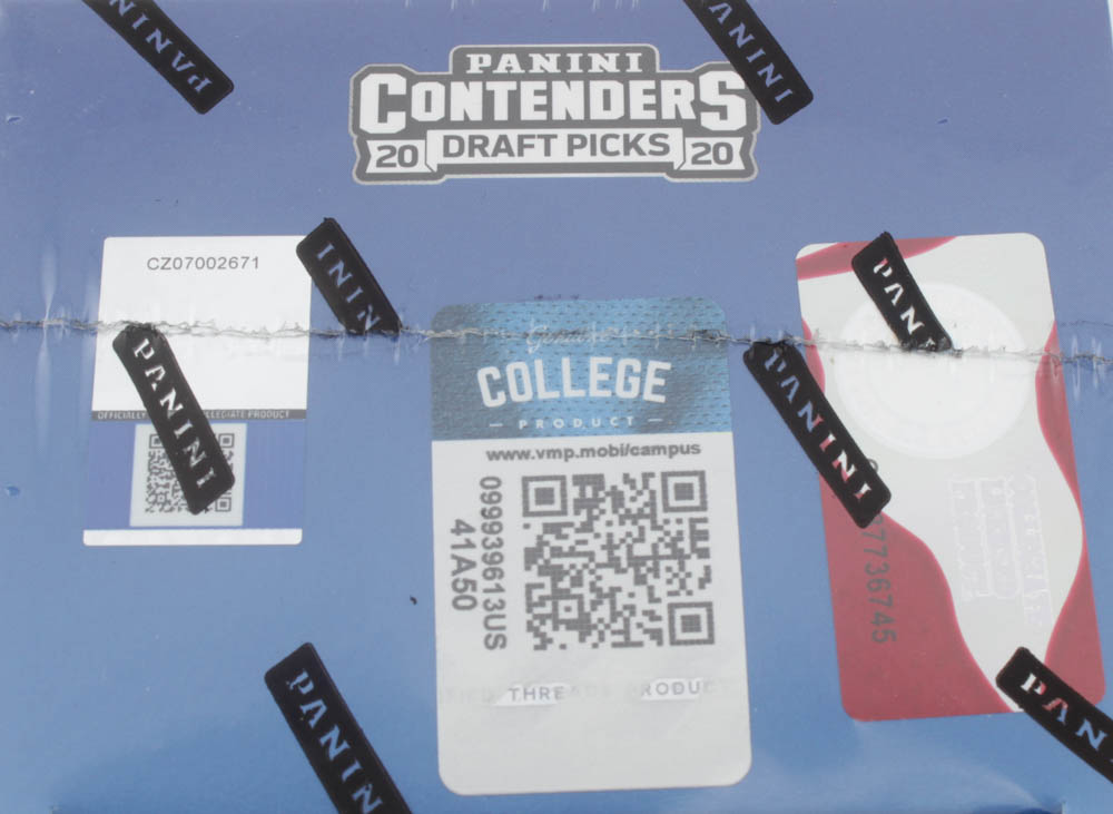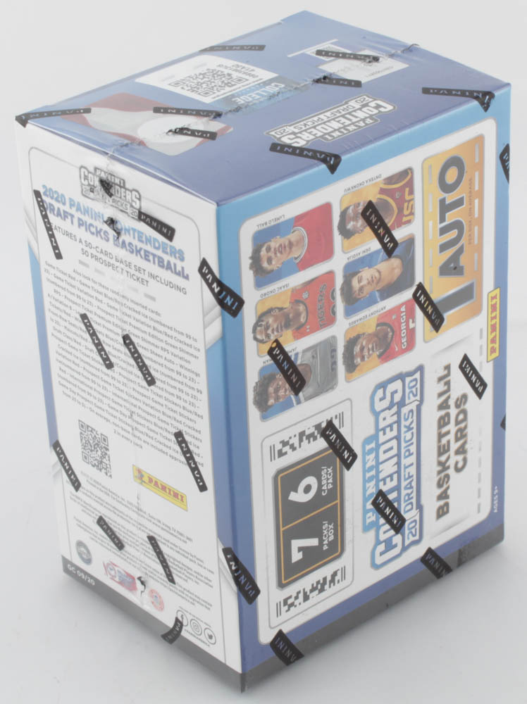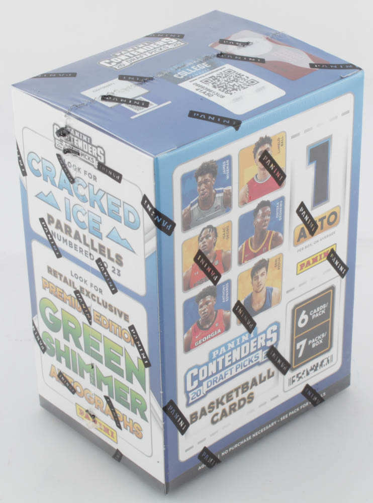 Panini presents the NBA 2020 Contenders Draft Pick trading card full box. Each box contains 7 packs per box, and 6 cards per pack. On average, there is 1 Autographed card per box. Be on the lookout for retail-exclusive premium edition Green Shimmer Autographs, and for the Cracked Ice Parallels numbered to 23.