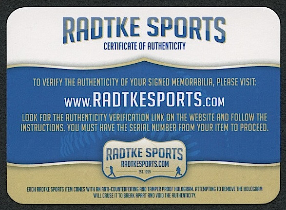 The lot / autograph(s) includes an official Radtke Sports hologram and matching COA for authenticity purposes. Also includes a proof picture from the signing.