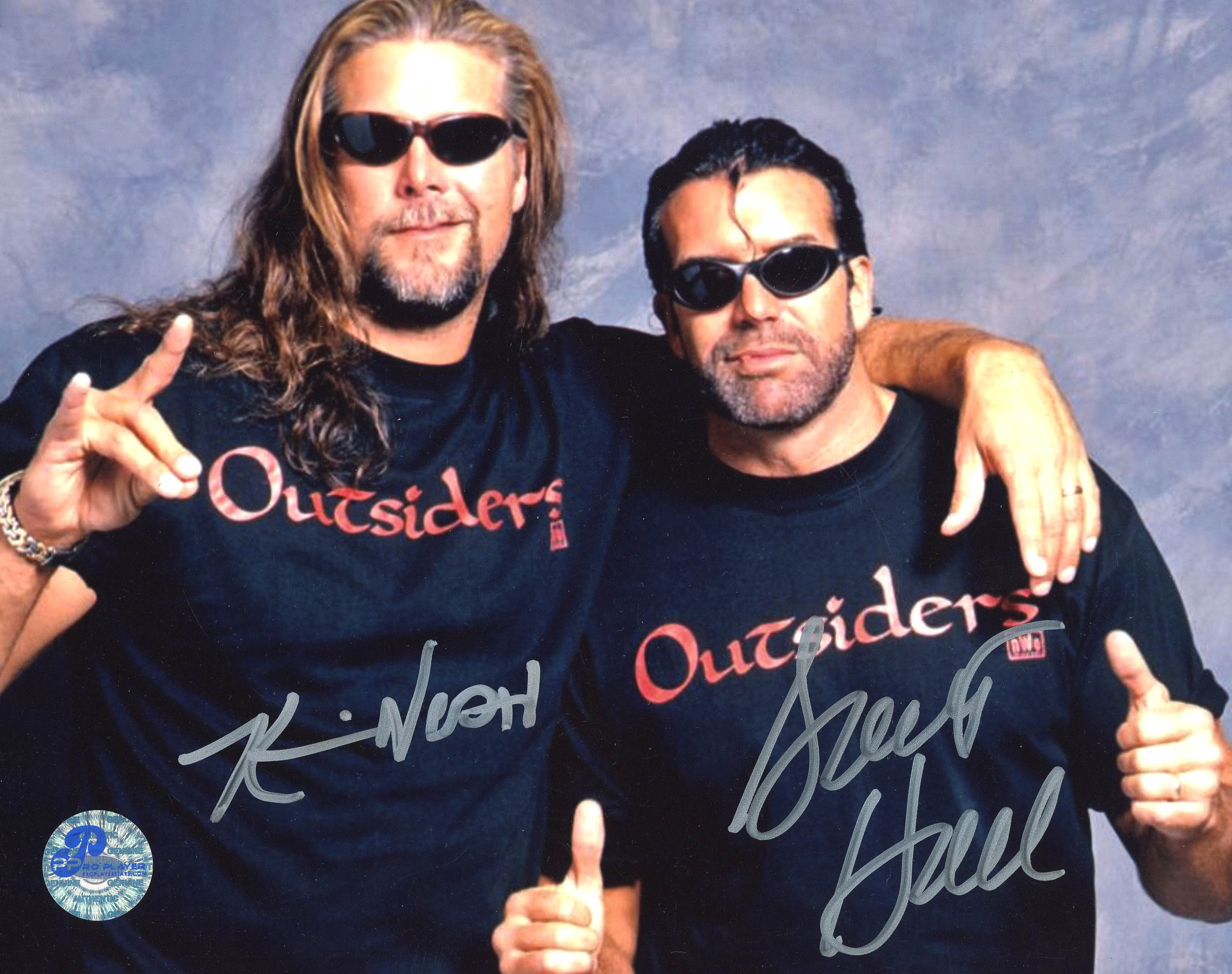 Photo measures 8" x 10" in size and has been hand-signed by Kevin Nash and Scott Hall.