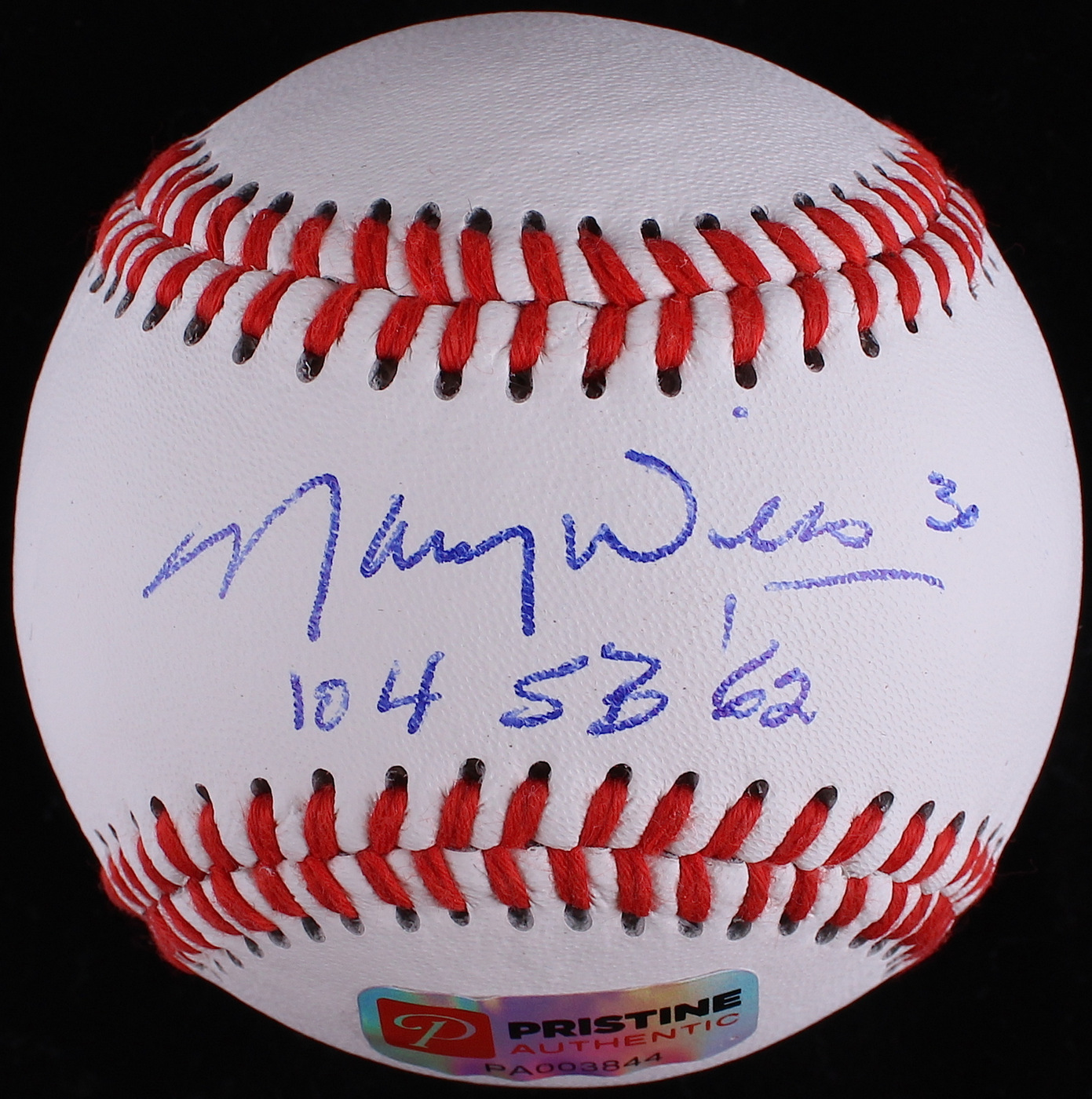 Rawlings Official League leather baseball hand-signed and inscribed on the sweet spot in blue ink by Maury Wills.