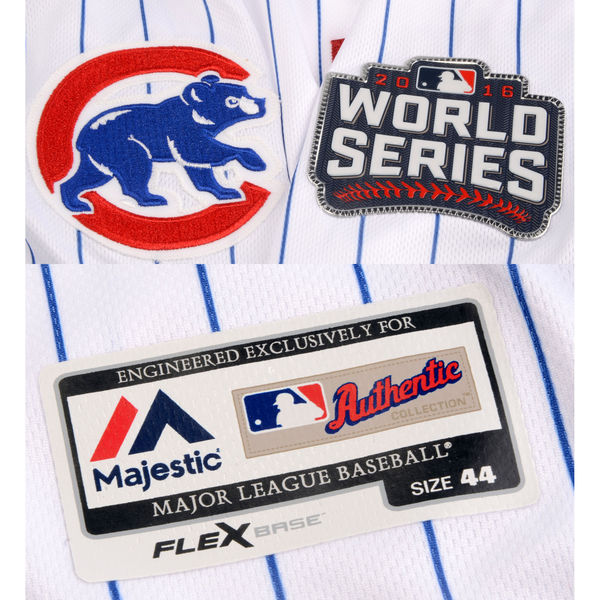 Majestic on-field style jersey, everything is sewn on, size 44. Hand-signed in silver paint pen by Kris Bryant.