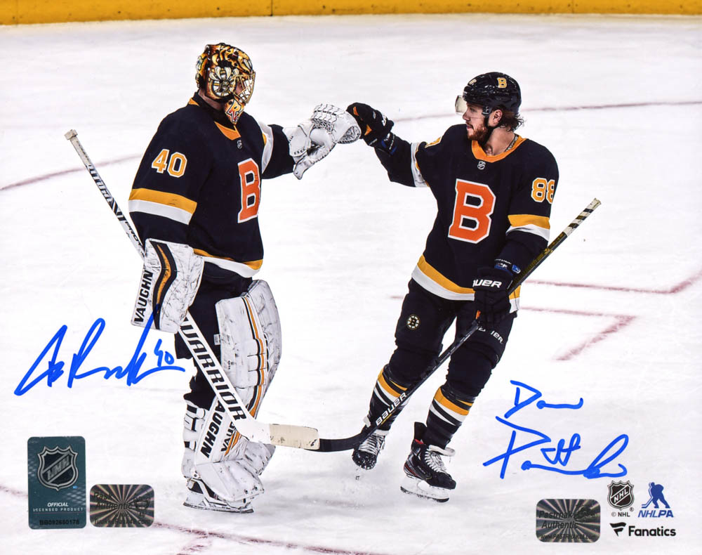 Photo measures 8" x 10" in size and has been hand-signed by David Pastrnak and Tuukka Rask (Boston Bruins).